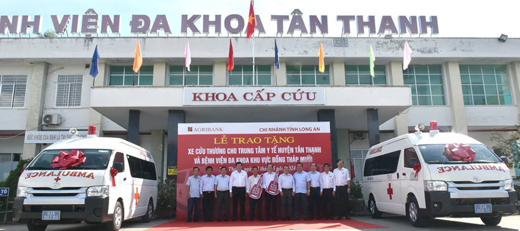 Agribank Long An trao xe cứu thương cho Trung tâm Y tế Tân Thạnh và Bệnh viện Đa khoa khu vực Đồng Tháp Mười