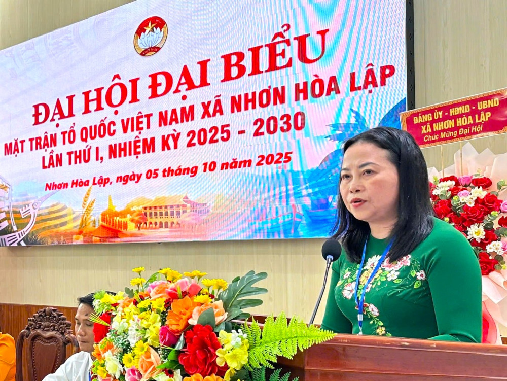 Ủy viên Ban Thường vụ Tỉnh ủy, Phó Chủ tịch Thường trực UBMTTQ Việt Nam tỉnh Nguyễn Thị Thu Trinh đề nghị MTTQ xã Nhơn Hòa Lập khóa mới tiếp tục đổi mới nội dung và phương thức hoạt động theo hướng sâu sát với dân, tập trung về cơ sở, thiết thực, hiệu quả, tránh hình thức; đa dạng hóa các hình thức vận động, tập hợp; tập trung triển khai có hiệu quả các cuộc vận động, phong trào thi đua do Mặt trận phát động, với phương châm “Hình thức tập trung, nội dung thiết thực; hành động quyết liệt, hiệu quả thực chất”.