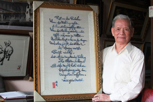 “Hiện tôi đã thêu tiếp bài thơ Cáo tật thị chúng của Mãn Giác Thiền Sư ra 16 thứ tiếng với 22 bức tranh và phấn đấu thêu cho đủ 20 thứ tiếng của những nước lấy Phật giáo làm quốc giáo như Thái Lan, Campuchia…”, lão thợ thêu 83 tuổi nói.