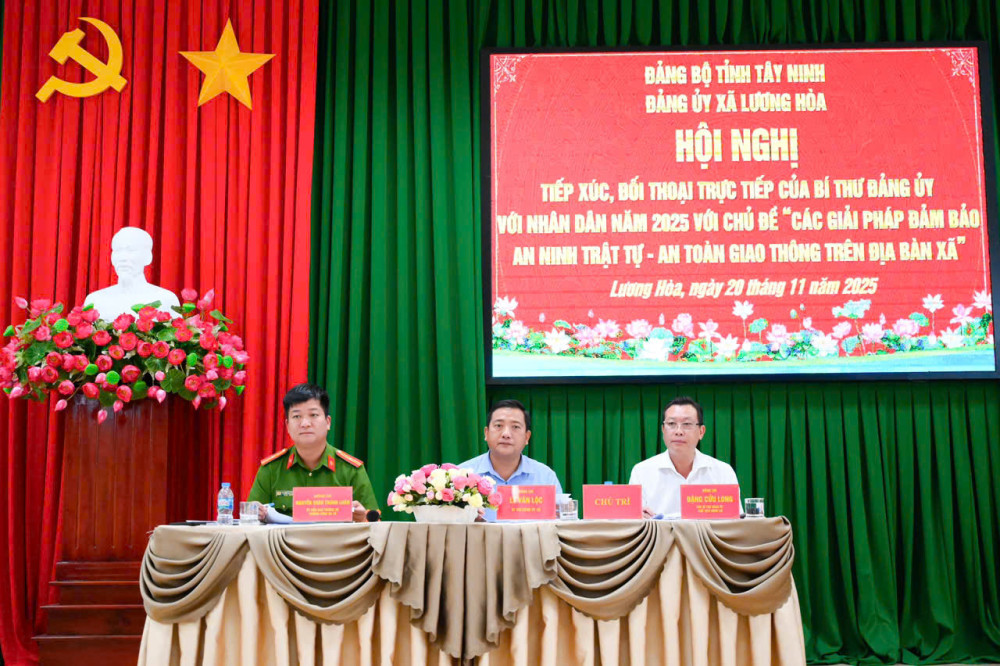 Chiều 20/11, Đảng ủy xã Lương Hòa, tỉnh Tây Ninh tổ chức Hội nghị đối thoại trực tiếp giữa Bí thư Đảng ủy xã với Nhân dân năm 2025 về chủ đề “Các giải pháp đảm bảo an ninh trật tự - an toàn giao thông trên địa bàn xã”.