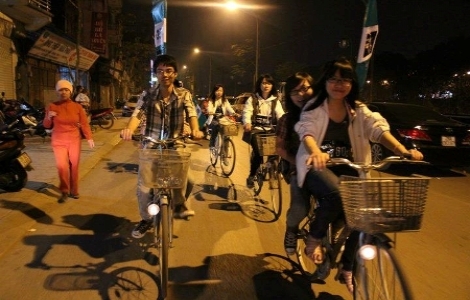 Đạp xe truyền thông tại Hà Nội với ánh sáng từ đèn vận hành bằng động cơ dinamo. |