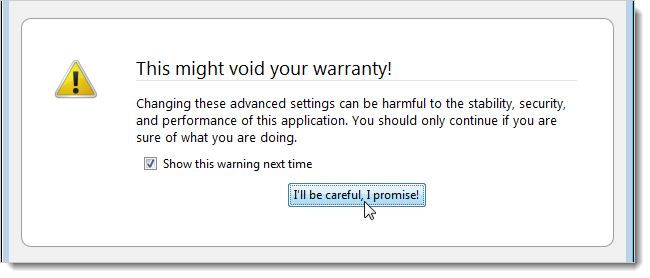 Nếu thông điệp dưới đây xuất hiện, hãy click vào “I’ll be careful, I promise” (Tôi xin hứa sẽ cẩn thận, tôi muốn tiếp tục) rồi tiếp tục. Nếu bạn không muốn thấy thông báo này, nhập about: config vào thanh địa chỉ, chọn “Show this warning next time” ( Hiển thị cảnh báo này vào lần tới), để không xuất hiện dấu kiểm tra trong checkbox.