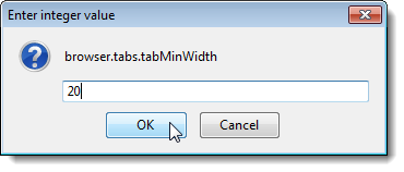 Bạn cũng có thể tạo một chiều rộng tối đa cho các tab. Kích đúp vào thiết lập browser.tabs.tabMaxWidth và nhập giá trị mới trong hộp thoại hiển thị. Giá trị mặc định cho các thiết lập browser.tabs.tabMaxWidth là 250.