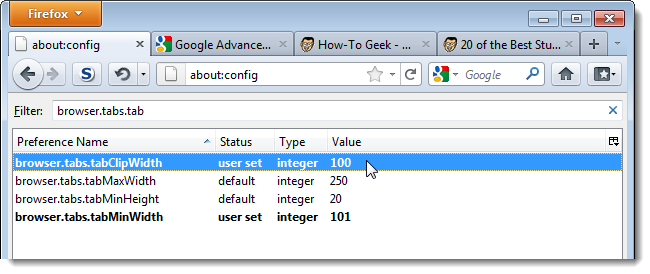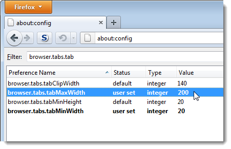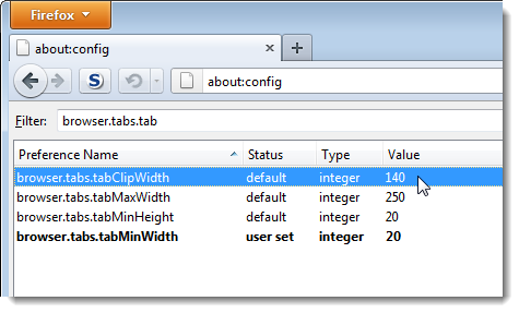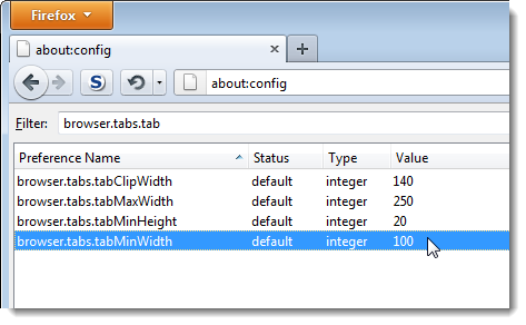 Bắt đầu nhập browser.tabs.tabMinWidth vào hộp chỉnh sửa bộ lọc. Khi thiết lập được tìm thấy phù hợp với giá trị bộ lọc của bạn, chúng được hiển thị trong danh sách. Kích đúp vào thiết lập browser.tabs.tabMinWidth để thay đổi nó.