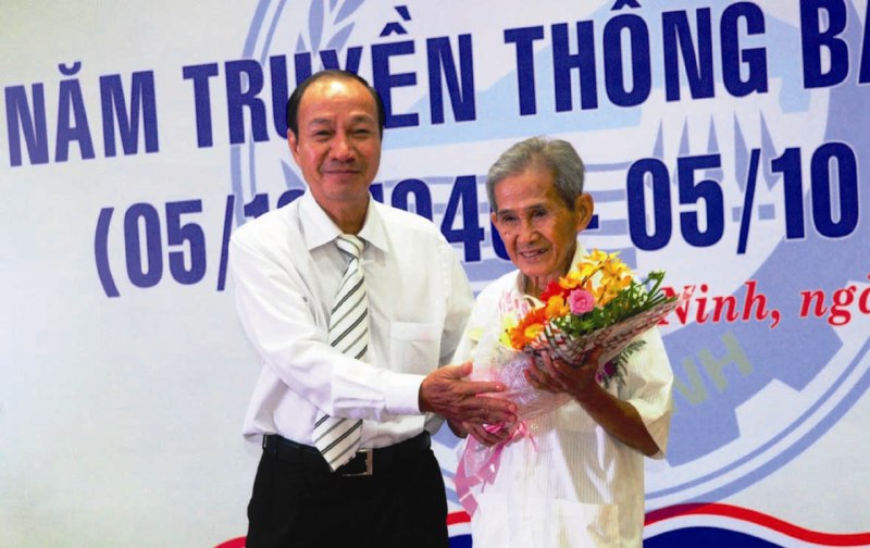 Tổng Biên tập Văn Công Cảnh tặng hoa chúc mừng chú Năm Choàng nhân dịp kỷ niệm 70 năm truyền thống Báo Tây Ninh.