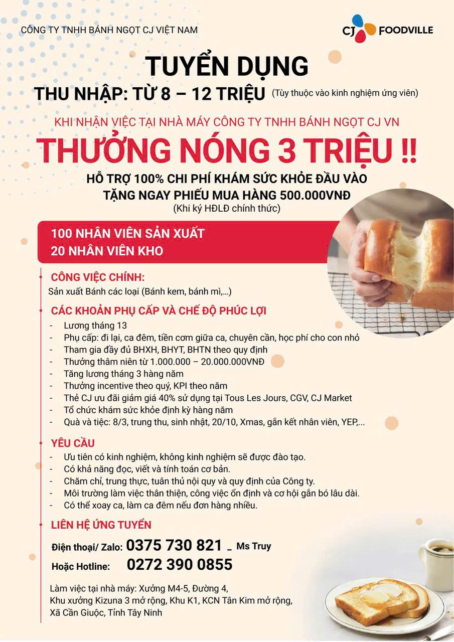 Công ty TNHH Bánh ngọt CJ Việt Nam tuyển dụng