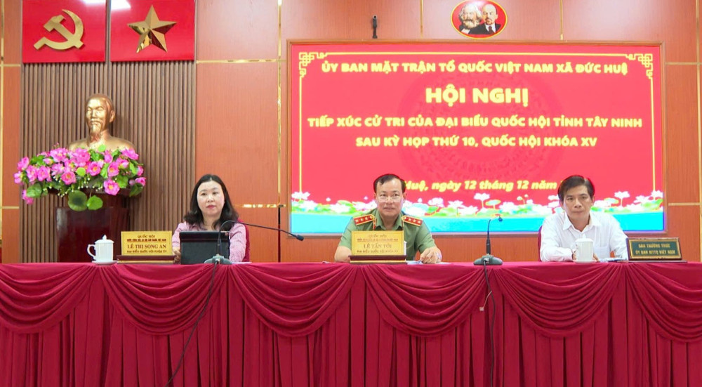 Chiều 12/12, Đoàn đại biểu Quốc hội (ĐBQH) tỉnh Tây Ninh gồm Thượng tướng Lê Tấn Tới - Ủy viên Ban Chấp hành Trung ương Đảng, Ủy viên Ủy ban Thường vụ Quốc hội, Chủ nhiệm Ủy ban Quốc phòng, An ninh và Đối ngoại của Quốc hội; Phó Trưởng đoàn chuyên trách Đoàn ĐBQH tỉnh Tây Ninh Lê Thị Song An có buổi tiếp xúc với hơn 100 cử tri xã Đức Huệ sau Kỳ họp thứ 10, Quốc hội khóa XV. Cùng dự có đại diện lãnh đạo sở, ngành tỉnh và địa phương.