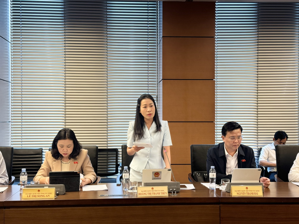 Góp ý đối với dự án Luật Thuế thu nhập cá nhân (sửa đổi), đại biểu Hoàng Thị Thanh Thúy - Phó Trưởng đoàn chuyên trách Đoàn ĐBQH tỉnh đề nghị xem xét lại việc sử dụng thuật ngữ “lợi tức cổ phần” tại điểm b khoản 3 Điều 3.