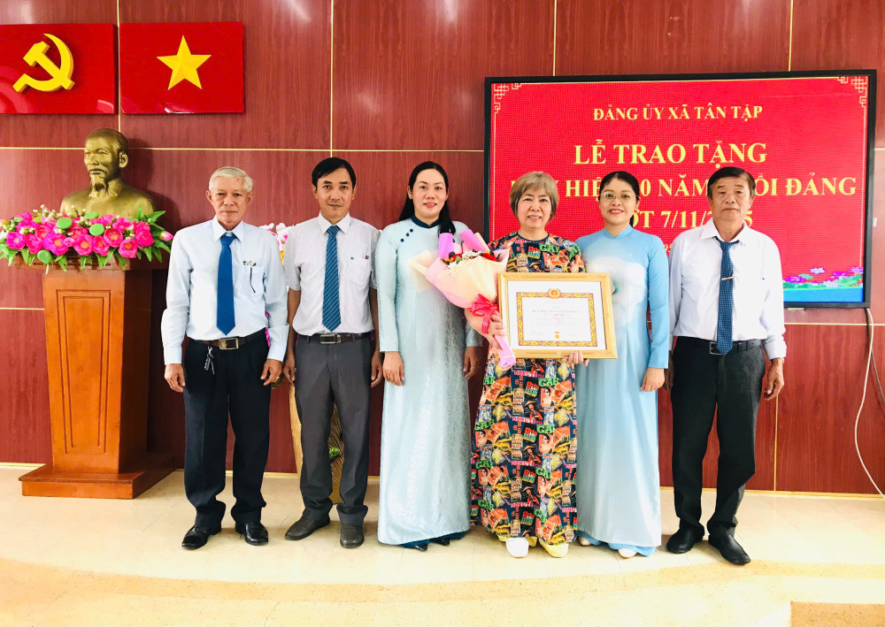 Cùng ngày, Phó Bí thư Thường trực Đảng uỷ xã Tân Tập Lê Thị Thanh Tú cũng trao tặng Huy hiệu 30 năm tuổi Đảng cho đảng viên Nguyễn Thị Kim Lan, sinh hoạt tại Chi bộ ấp Bắc.