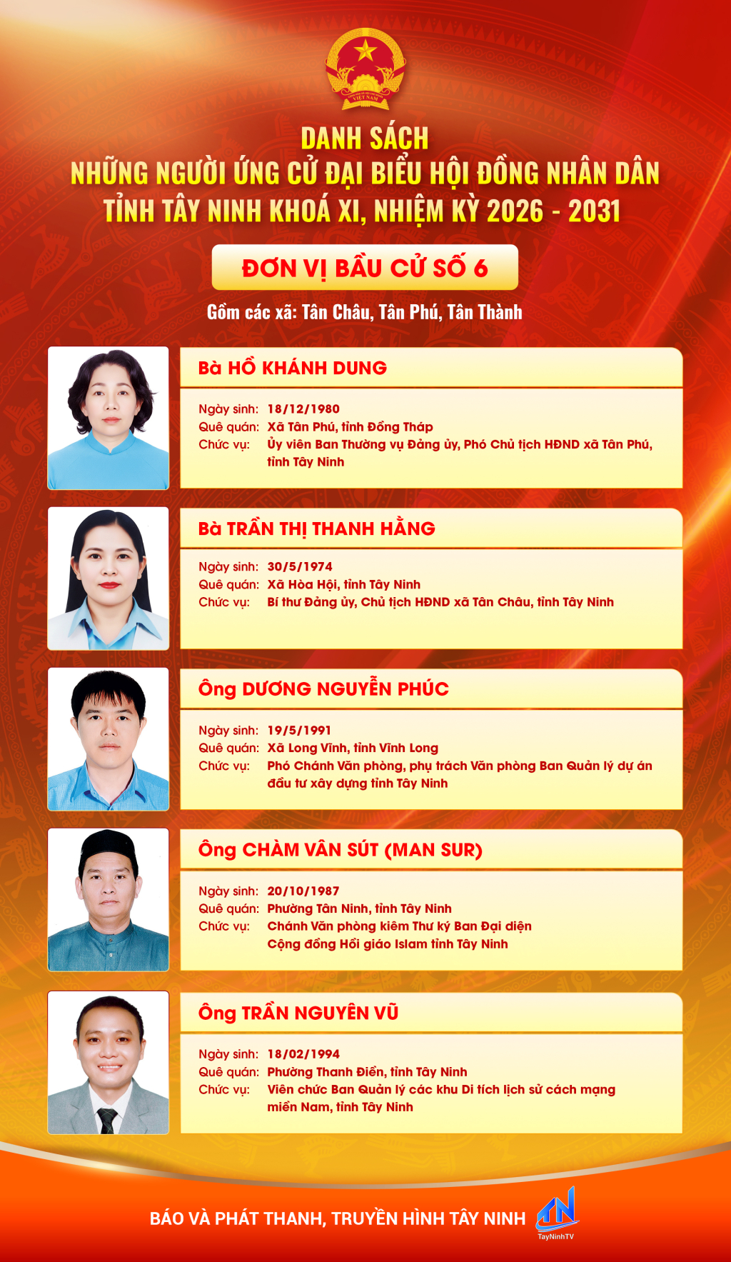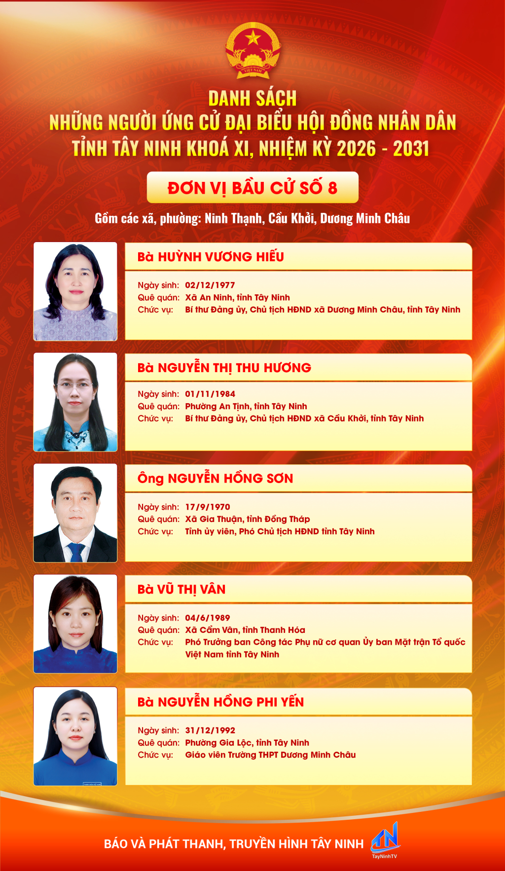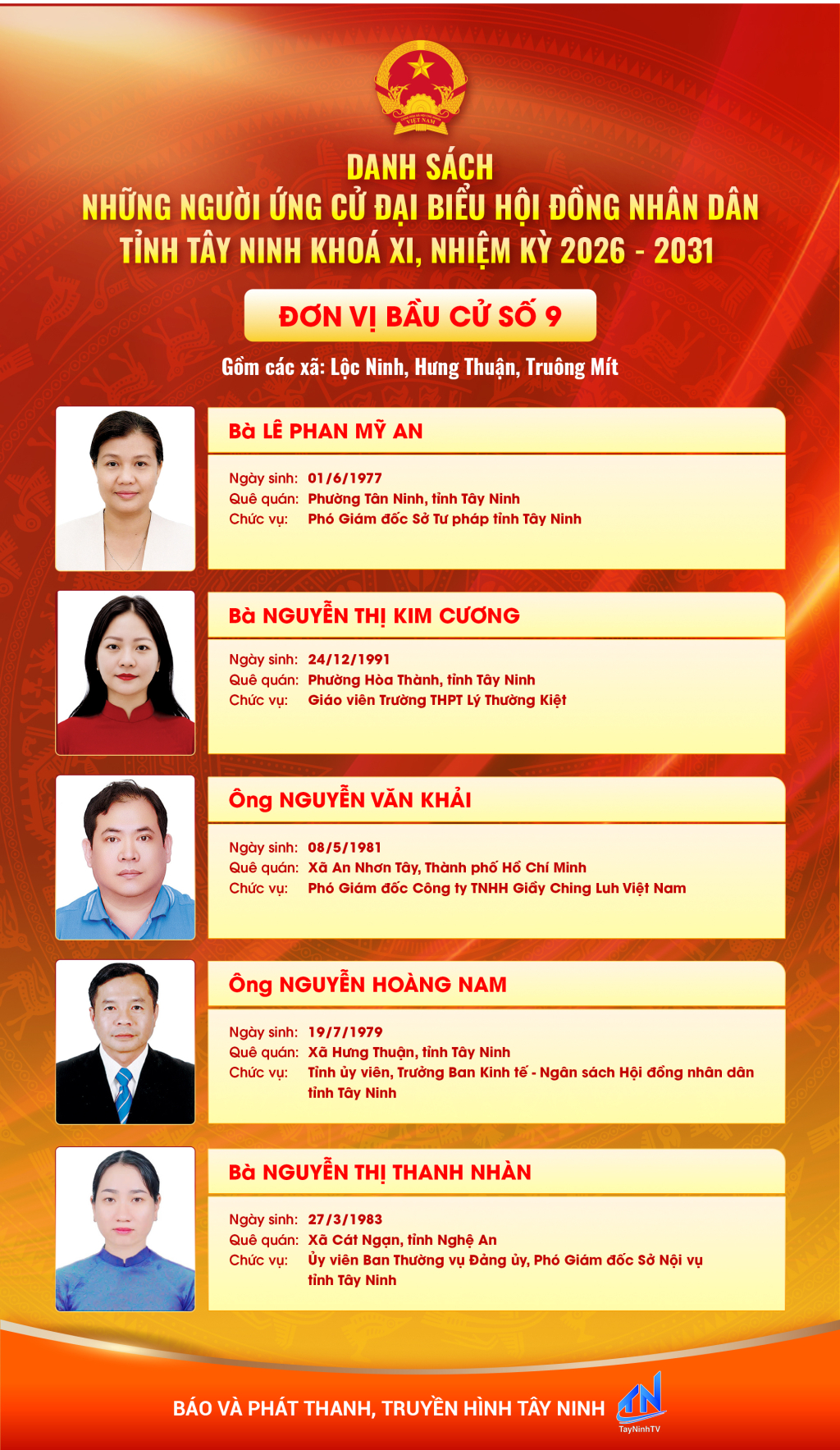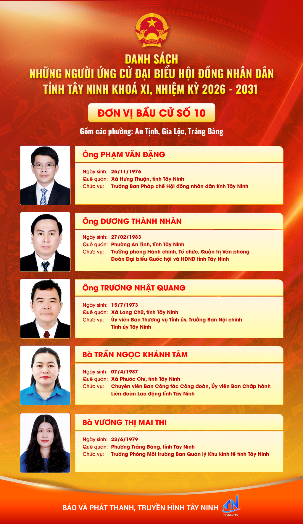Danh sách những người ứng cử đại biểu HĐND tỉnh Tây Ninh khóa XI, nhiệm kỳ 2026 - 2031 (Đơn vị bầu cử số 6,7,8,9,10)