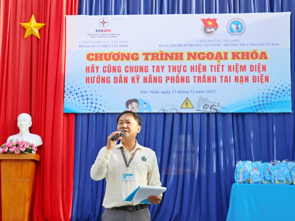 Sáng 15/12, tại Trường THCS Trần Hưng Đạo (phường Tân Ninh, tỉnh Tây Ninh), Công ty Điện lực Tây Ninh phối hợp Phường đoàn Tân Ninh, Ban giám hiệu Trường tổ chức chương trình tuyên truyền ngoại khóa “Hãy chung tay tiết kiệm điện và hướng dẫn kỹ năng phòng tránh tai nạn điện” cho học sinh.