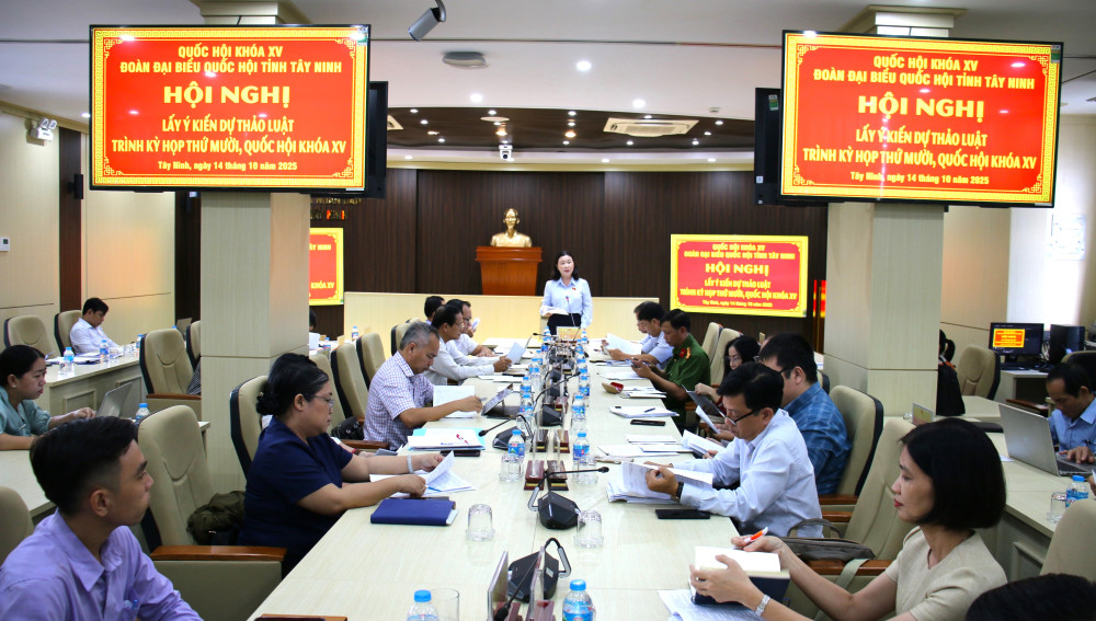 Chiều 14/10, Đoàn đại biểu Quốc hội (ĐBQH) tỉnh Tây Ninh tổ chức Hội nghị lấy ý kiến dự thảo Luật trình Kỳ họp thứ 10, Quốc hội khóa XV. Phó Trưởng đoàn chuyên trách Đoàn ĐBQH tỉnh Tây Ninh Lê Thị Song An chủ trì hội nghị.