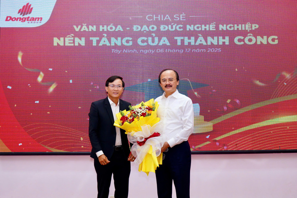 Với phong cách gần gũi, cởi mở và mộc mạc, Chủ tịch HĐQT Dongtam Group Võ Quốc Thắng mang đến bài học thực tế và sâu sắc từ hành trình hơn 56 năm phát triển thương hiệu Đồng Tâm. Ông chia sẻ: “Thành công không chỉ đến từ kiến thức, mà từ thái độ, kỷ luật và tinh thần trách nhiệm. Người có nghề giỏi chưa chắc đã thành công, nhưng người có đạo đức và văn hóa nghề nghiệp thì chắc chắn sẽ được tin tưởng và phát triển”. Đó là triết lý đã giúp Dongtam Group phát triển bền vững dựa trên giá trị con người và văn hóa doanh nghiệp.