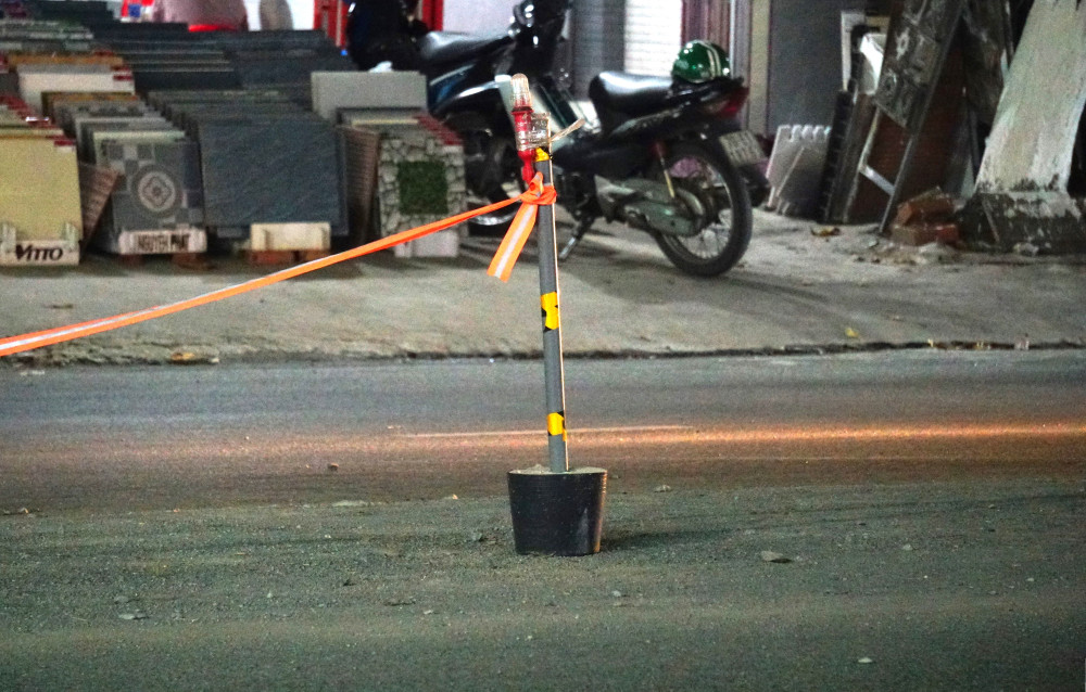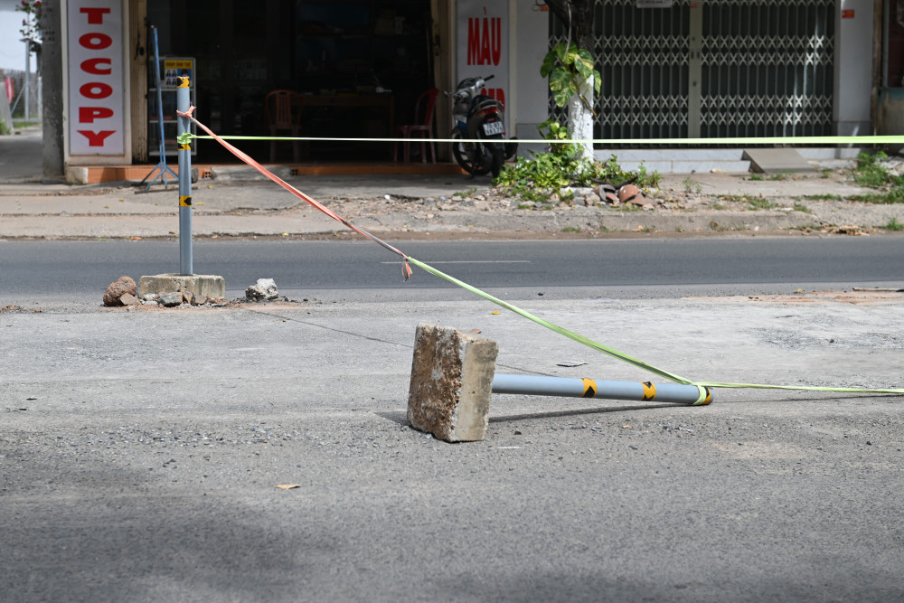 Đối với những đoạn con lươn đã thi công xong phần nền hạ, nhà thầu đặt dải phân cách di động gồm nhiều trụ sắt trên bệ bê tông xi măng, nối liền nhau bằng sợi dây để giăng lại.