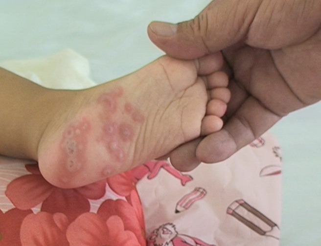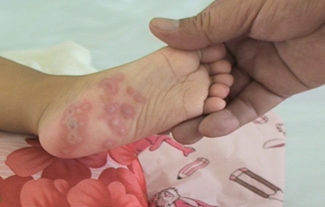 | Những mụn nước dưới chân của một bé trai bị bệnh tay chân miệng |