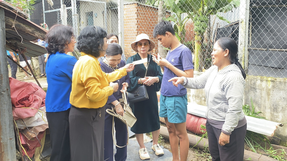 Các thành viên Câu lạc bộ nữ từ thiện Tây Ninh hỗ trợ tiền khám bệnh cho con trai của bà Dương Thị Nhan (thứ 2 từ phải qua)