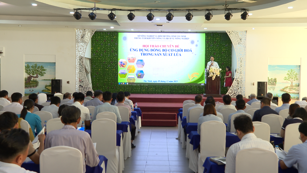 Sáng 09/12, Trung tâm Khuyến nông và Dịch vụ nông nghiệp tỉnh Tây Ninh tổ chức Hội thảo “Ứng dụng đồng bộ cơ giới hóa trong sản xuất lúa”, thu hút hơn 100 đại biểu là cán bộ nông nghiệp, nông dân sản xuất giỏi và hợp tác xã đến từ 25 xã, phường trên toàn tỉnh tham dự.