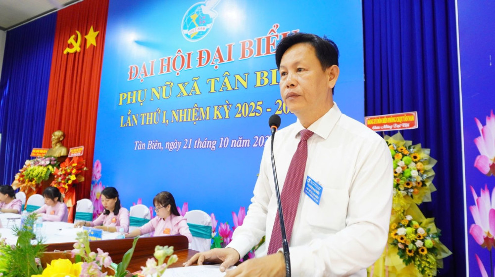 Phát biểu chỉ đạo tại Đại hội, Bí thư Đảng ủy, Chủ tịch HĐND xã Lê Long Giang đề nghị Hội LHPN xã tiếp tục đổi mới nội dung, phương thức hoạt động; phát huy vai trò nòng cốt trong công tác tập hợp, đoàn kết, chăm lo, bảo vệ quyền và lợi ích hợp pháp, chính đáng của phụ nữ; chủ động ứng dụng công nghệ số trong hoạt động Hội, tích cực tham gia xây dựng Đảng, chính quyền, góp phần phát triển xã Tân Biên ngày càng văn minh, hiện đại.