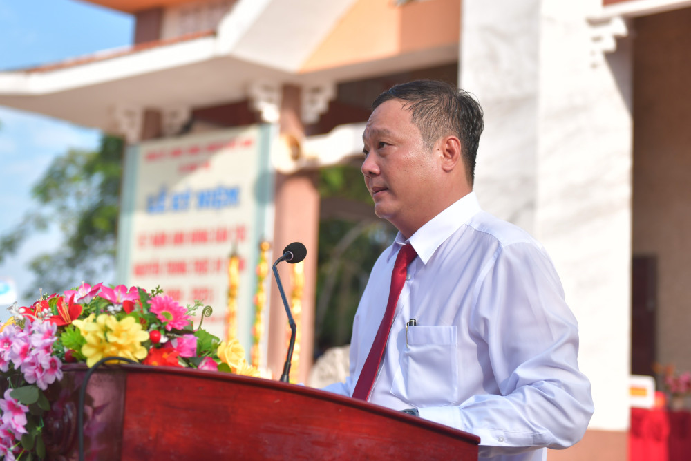 Chủ tịch UBND xã Nhựt Tảo Trương Minh Trí phát biểu ôn lại truyền thống tại buổi lễ