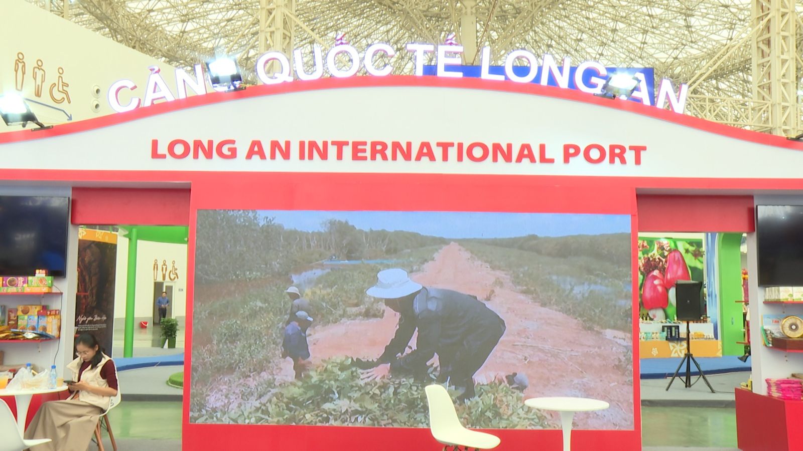 Giữa trung tâm không gian là biểu tượng “Dòng sông Vàm Cỏ” được tái hiện bằng mô hình 3D mềm mại, uốn lượn quanh những thuyền ba lá chở đầy nông sản, tàu container mang logo doanh nghiệp - ẩn dụ cho hành trình phát triển từ nông nghiệp truyền thống đến công nghiệp hiện đại.