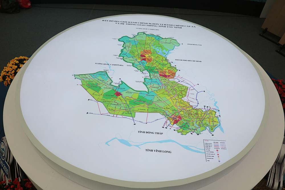 Nổi bật tại trung tâm là sa bàn bản đồ hành chính Tây Ninh với 96 đơn vị sau sáp nhập, được dựng nổi 3D, kết hợp ánh sáng LED chiếu điểm, biểu trưng cho tinh thần thống nhất, đổi mới và tầm nhìn phát triển bền vững của địa phương.