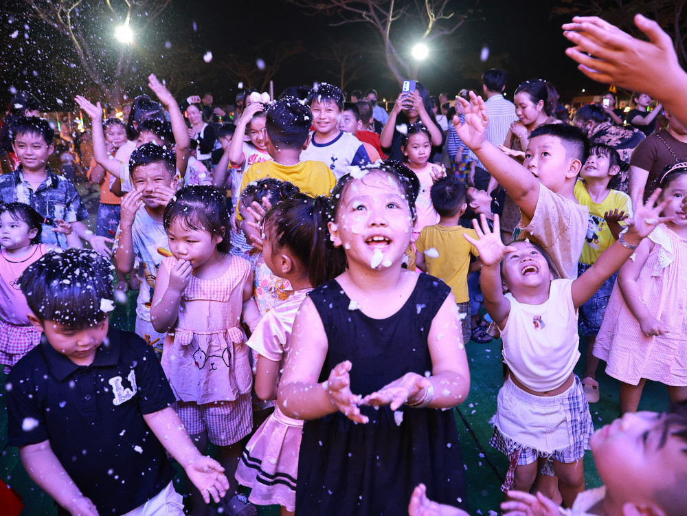 Người lớn và trẻ em hớn hở cùng tuyết phun trắng xoá