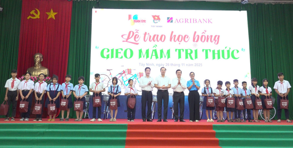 (BTNO) - Ngày 26/11, tại Trung tâm Cung ứng dịch vụ công xã Hậu Nghĩa, Tỉnh Đoàn Tây Ninh phối hợp Báo Tuổi Trẻ tổ chức trao 200 suất học bổng “Gieo mầm tri thức” cho học sinh có hoàn cảnh khó khăn đạt thành tích khá, giỏi trên địa bàn xã Hậu Nghĩa và xã Đức Hoà. Chương trình do Agribank Chi nhánh Phú Nhuận TP.HCM tài trợ với tổng kinh phí hơn 400 triệu đồng.
