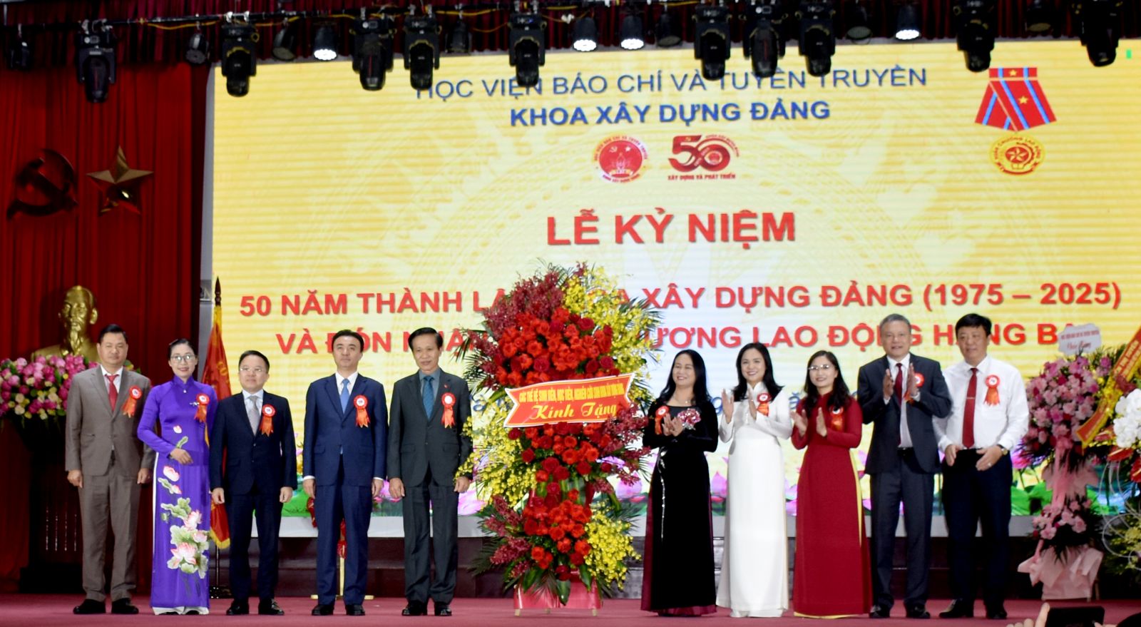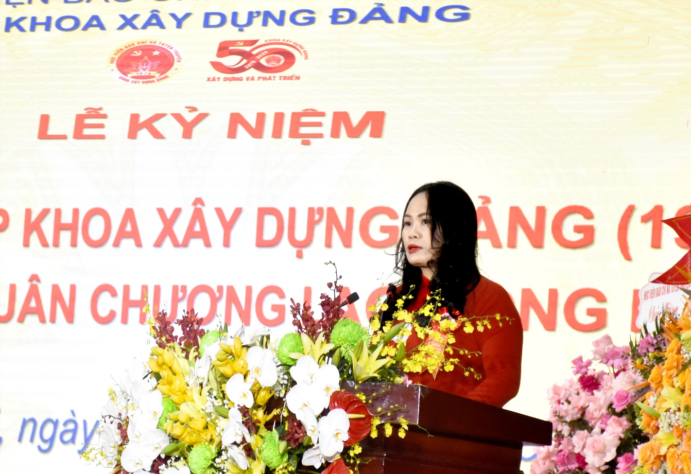 Trong không khí trang trọng của buổi Lễ, PGS, TS. Trần Thị Hương, Bí thư Chi bộ, Trưởng khoa Xây dựng Đảng đã đọc Diễn văn ôn lại chặng đường 50 năm xây dựng và phát triển của Khoa. Từ khi được tách ra từ Khoa Lịch sử Đảng của Trường Tuyên huấn Trung ương năm 1975 đến nay, với nỗ lực bền bỉ của các thế hệ nhà giáo, cán bộ, giảng viên, sinh viên, học viên, nghiên cứu sinh, Khoa Xây dựng Đảng đã khẳng định vị thế là khoa trọng điểm, mũi nhọn của Học viện Báo chí và Tuyên truyền, được Đảng và Nhà nước trao tặng nhiều phần thưởng cao quý, trong đó có Huân chương Lao động hạng Ba (2005), Huân chương Lao động hạng Nhì (2015).