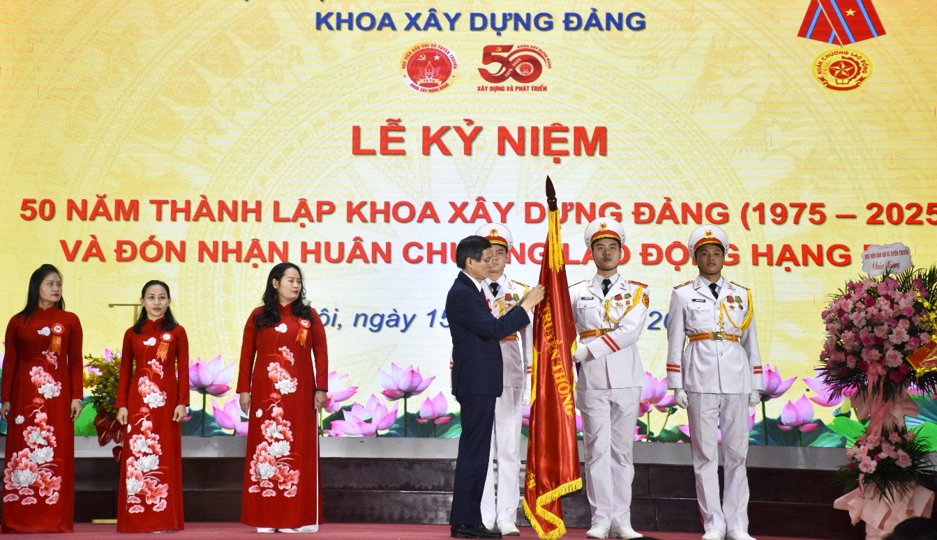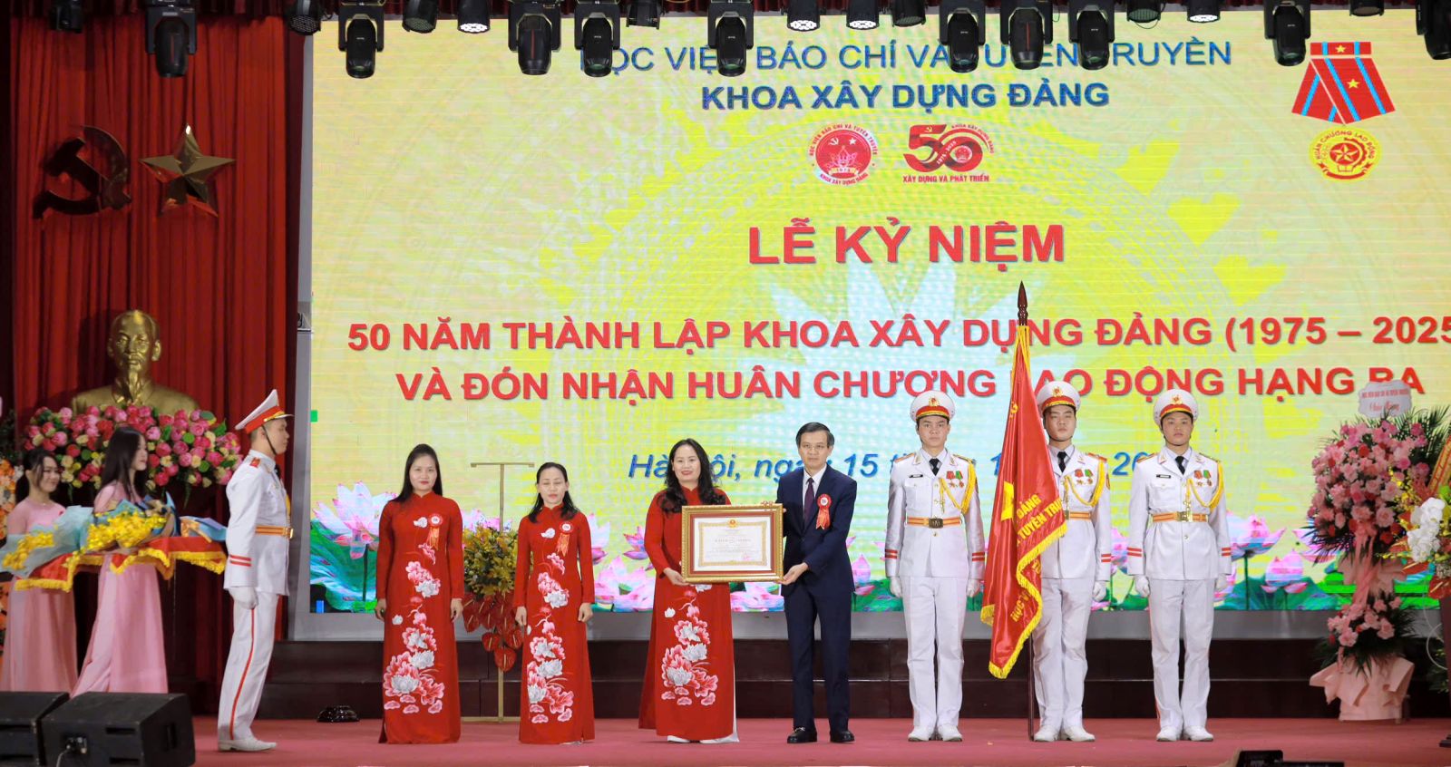Sáng 15/11, Khoa Xây dựng Đảng long trọng tổ chức Lễ kỷ niệm 50 năm thành lập (1975 - 2025) và đón nhận Huân chương Lao động hạng Ba - phần thưởng cao quý của Đảng và Nhà nước, ghi nhận những thành tích xuất sắc của Khoa trong nửa thế kỷ xây dựng và phát triển. PGS, TS Đoàn Minh Huấn, Ủy viên Trung ương Đảng, Phó Bí thư Thường trực Đảng ủy, Phó Giám đốc Thường trực Học viện Chính trị quốc gia Hồ Chí Minh dự, trao Huân chương Lao động hạng Ba cho Khoa Xây dựng Đảng và phát biểu tại Lễ kỷ niệm.