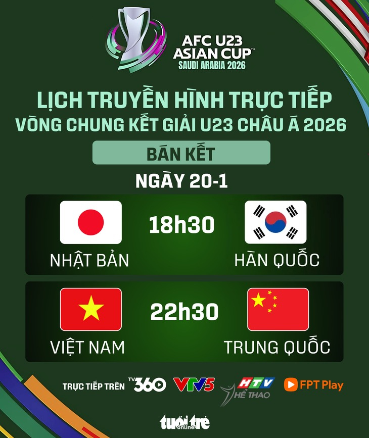 Lịch trực tiếp bán kết Giải U23 châu Á 2026: U23 Việt Nam đấu Trung Quốc