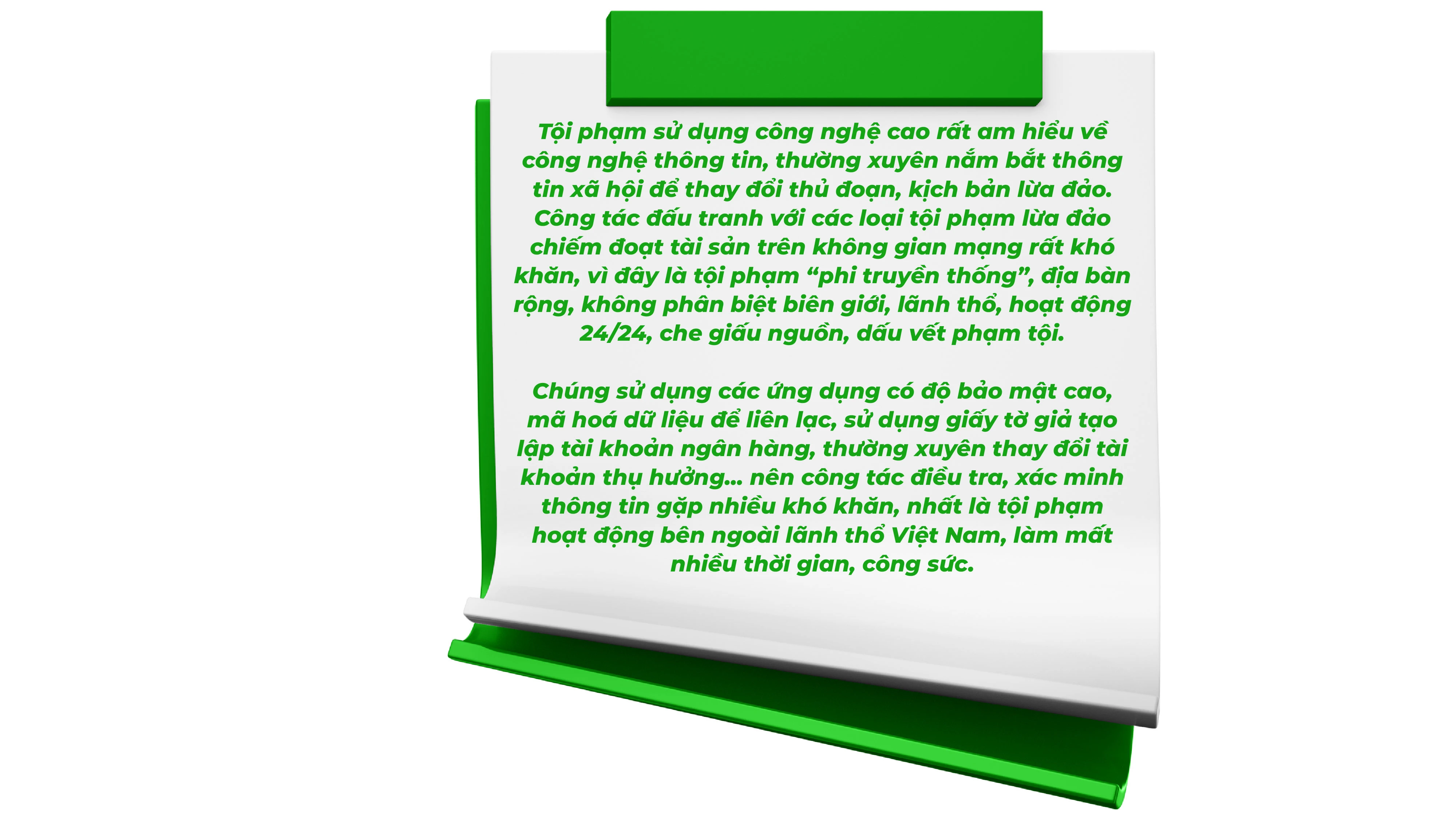 Thượng tá Phạm Bảo Thịnh- Phó trưởng Phòng An ninh mạng và phòng, chống tội phạm sử dụng công nghệ cao cho biết, tội phạm sử dụng công nghệ cao hoạt động chuyên nghiệp, có tổ chức, trình độ cao, ẩn danh, địa bàn hoạt động không phụ thuộc vào biên giới. Bên cạnh đó, chúng lợi dụng vào những người thiếu cảnh giác, thiếu hiểu biết về công nghệ, kiến thức để thực hiện hành vi phạm tội.