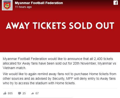 Myanmar đã bán hết sạch vé dành cho CĐV Việt Nam