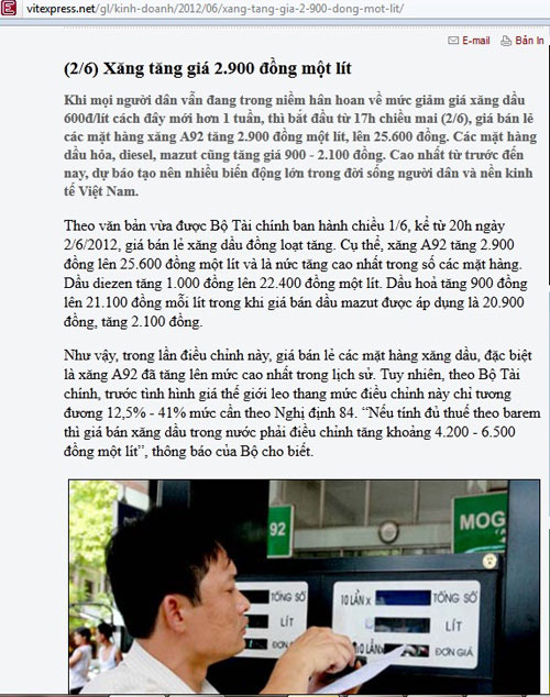 Ngày 1.6, trên rất nhiều các diễn đàn và mạng xã hội đều xôn xao về nguồn tin giá xăng sẽ tăng thêm 2.900 đồng/ lít. Theo tìm hiểu, nguồn thông tin trên được phát đi từ một trang web có tên miền http://vitexpress.net, có giao diện giống hệt với một trang báo điện tử được nhiều người truy cập tại Việt Nam. Tuy nhiên, trang web này là giả mạo và nguồn thông tin cũng là thông tin “vịt”.