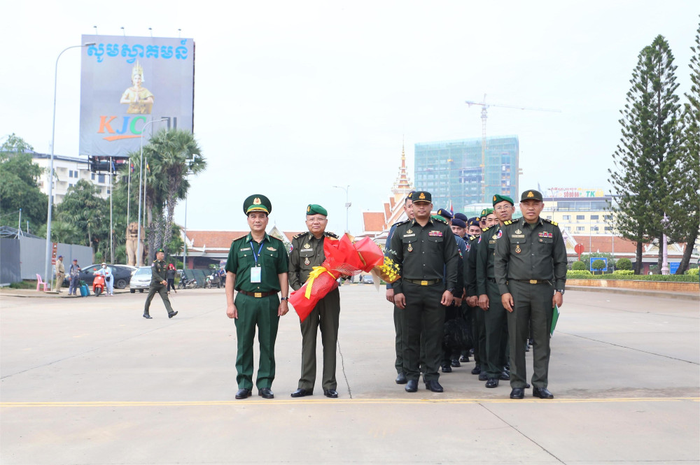 Đại tá Nguyễn Quốc Hiếu – Phó Chủ nhiệm Chính trị Bộ đội Biên phòng Việt Nam, tặng hoa chúc mừng đoàn sĩ quan trẻ Vương quốc Campuchia