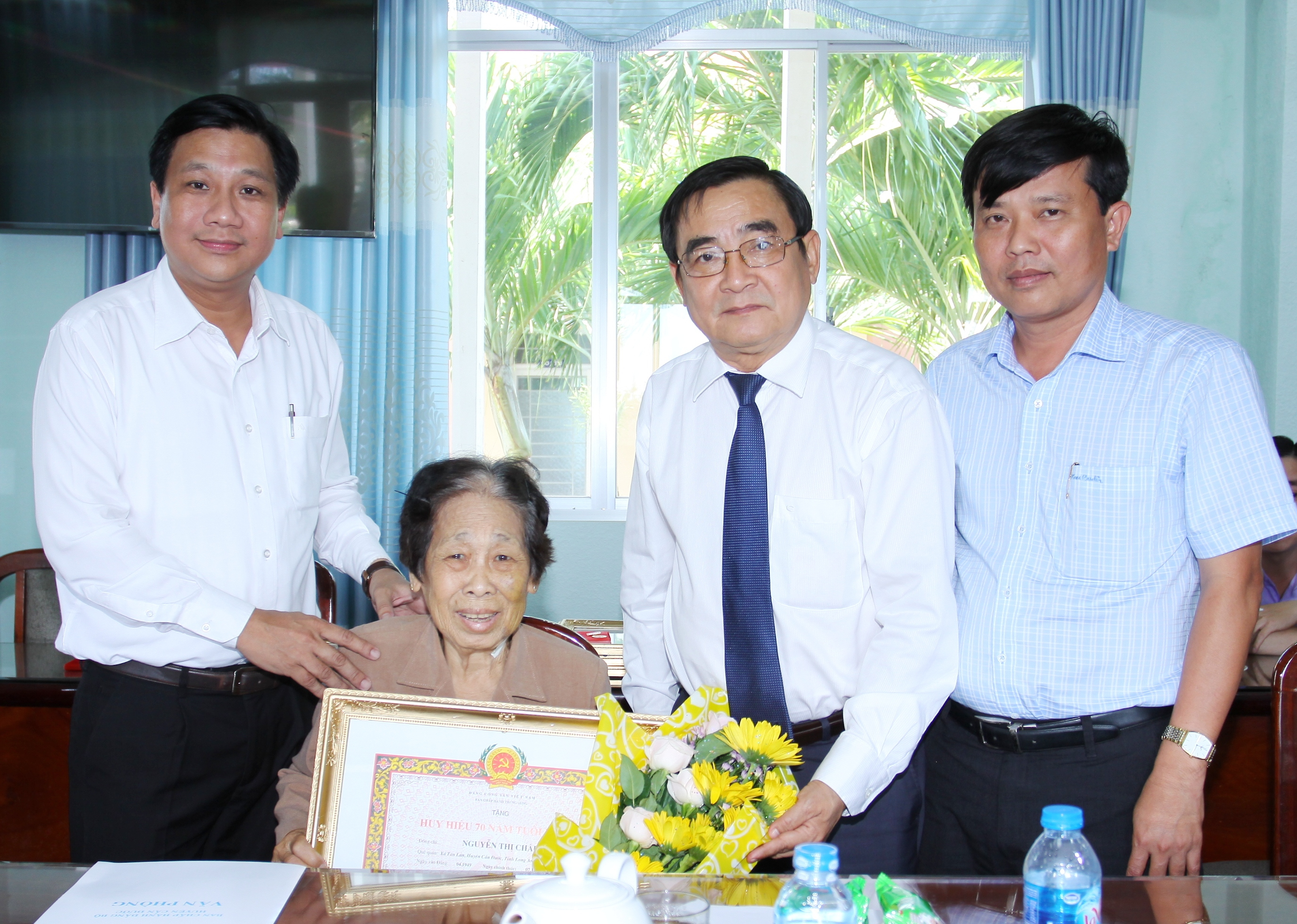 Phó bí thư thường trực Tỉnh ủy Đỗ Hữu Lâm trao huy hiệu 40, 50, 55 và 70 năm tuổi Đảng
