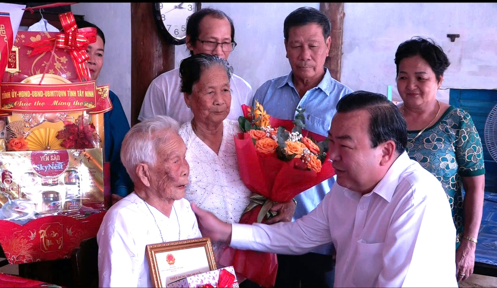 Phó Bí thư Tỉnh ủy Phạm Hùng Thái chúc thọ công dân tròn 100 tuổi và tặng quà cho trẻ em tại xã Bình Hiệp