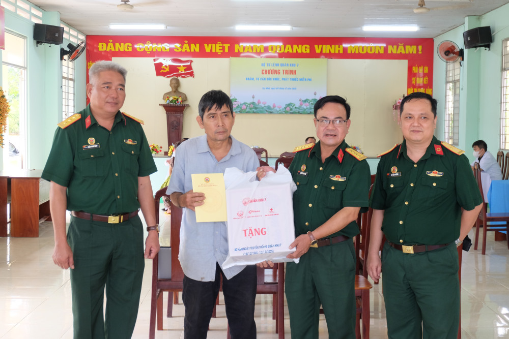 Tại đây, đoàn y, bác sĩ Bệnh viện Quân y 7A, Bệnh viện Quân y 7B và Bệnh viện Quân Dân y Miền Đông khám bệnh, tư vấn sức khỏe và phát thuốc miễn phí cho 400 người dân, đối tượng chính sách có hoàn cảnh khó khăn trên địa bàn 3 xã.