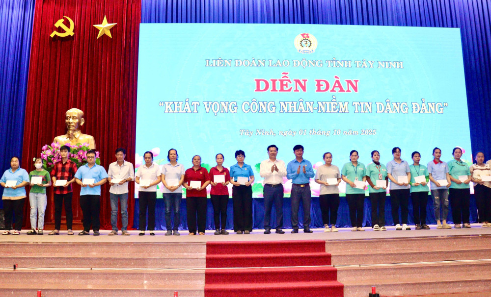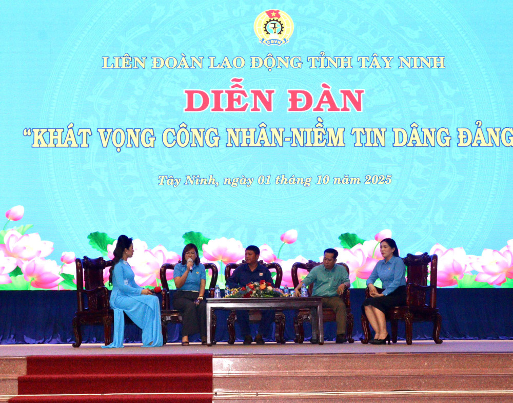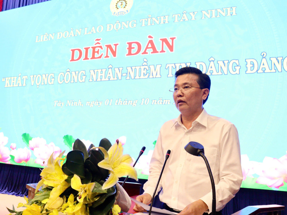 (BTNO) - Chiều 01/10, Liên đoàn Lao động tỉnh Tây Ninh tổ chức Diễn đàn “Khát vọng công nhân – Niềm tin dâng Đảng”. Tham dự có Phó Bí thư Tỉnh ủy, Chủ tịch UBMTTQ Việt Nam tỉnh Tây Ninh Nguyễn Thanh Hải cùng 300 đại biểu là cán bộ, đoàn viên công đoàn trên địa bàn tỉnh.