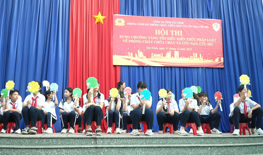 Ngày 11/12, Đội Chữa cháy và cứu nạn, cứu hộ (CNCH) khu vực Hòa Thành – Châu Thành, phòng Cảnh sát phòng cháy, chữa cháy (PCCC) và CNCH Công an Tây Ninh tổ chức Hội thi Rung chuông vàng tìm hiểu kiến thức pháp luật về PCCC và CNCH tại Trường THCS Trần Hưng Đạo (phường Tân Ninh, tỉnh Tây Ninh), với sự tham gia của 50 em học sinh được chọn ở các lớp, cùng 1.720 học sinh, giáo viên tham gia cổ vũ.