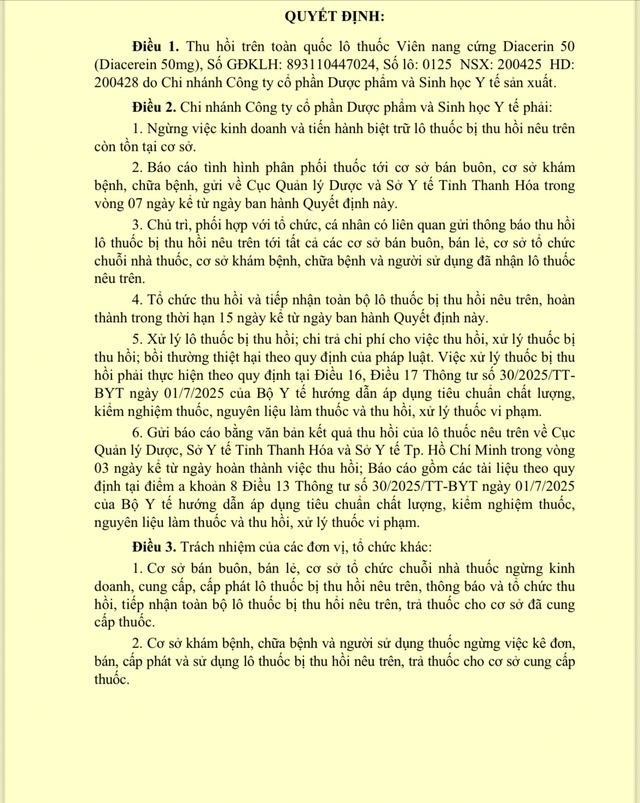 Thu hồi toàn quốc lô thuốc viên nang cứng Diacerin 50 do vi phạm chất lượng