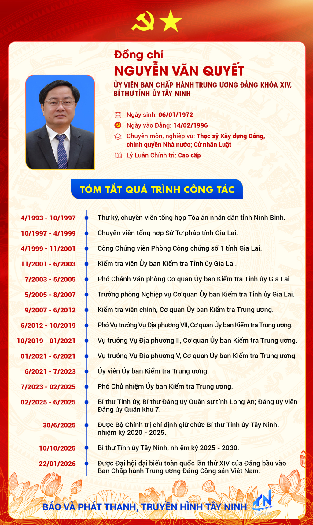 Tóm tắt quá trình công tác của Ủy viên Ban Chấp hành Trung ương Đảng khóa XIV, Bí thư Tỉnh ủy Tây Ninh Nguyễn Văn Quyết