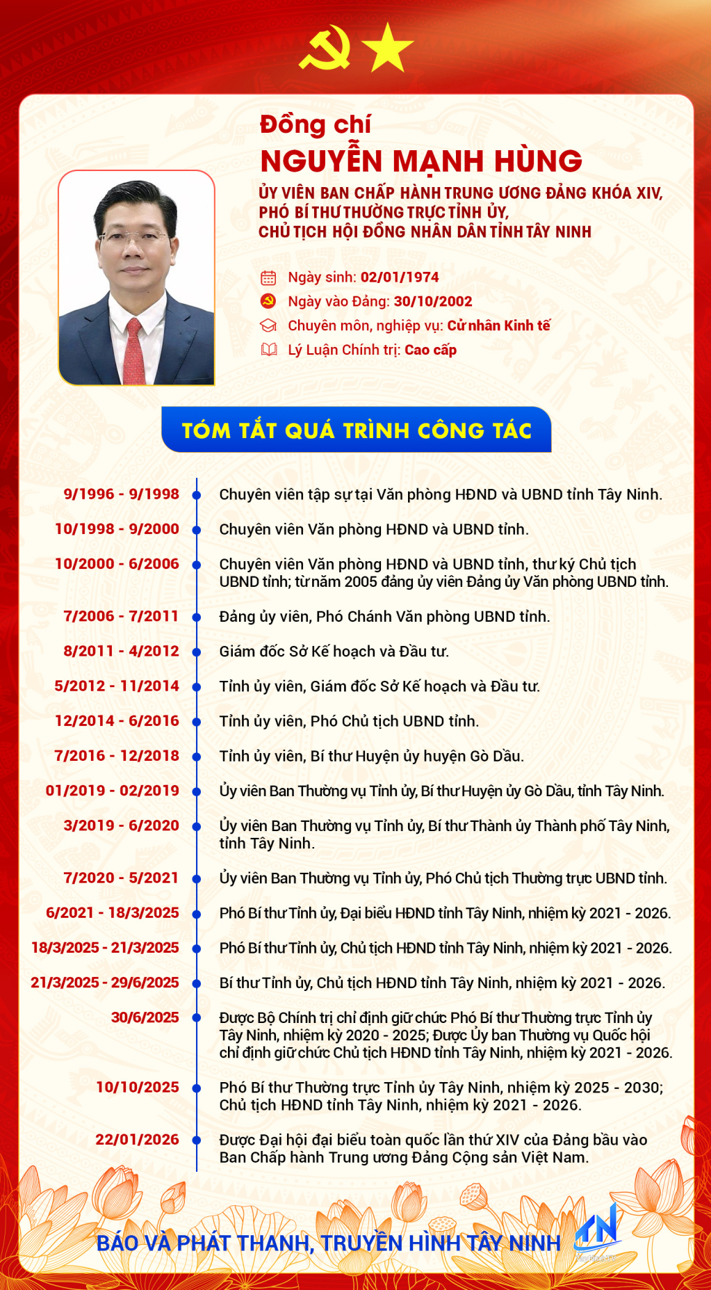 Tóm tắt quá trình công tác của Ủy viên Ban Chấp hành Trung ương Đảng khóa XIV, Phó Bí thư Thường trực Tỉnh ủy, Chủ tịch HĐND tỉnh Tây Ninh Nguyễn Mạnh Hùng