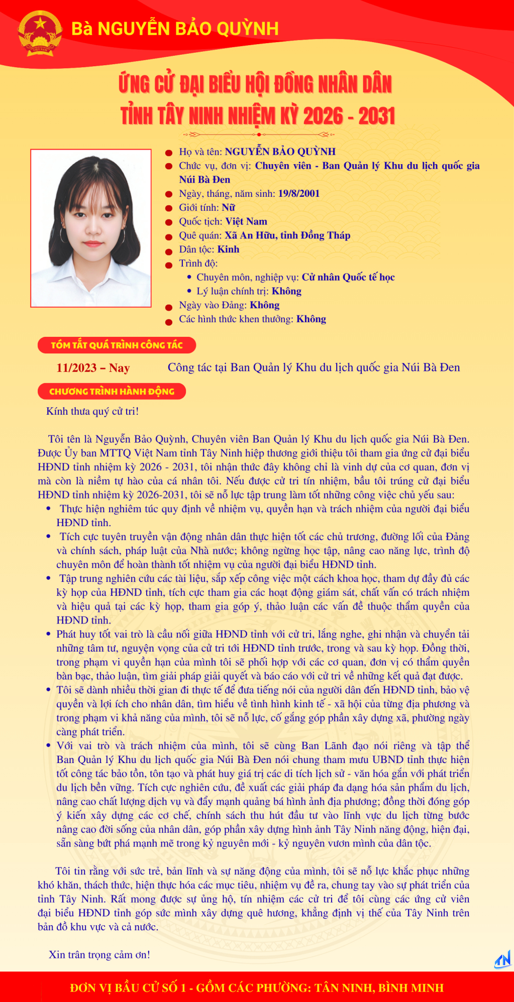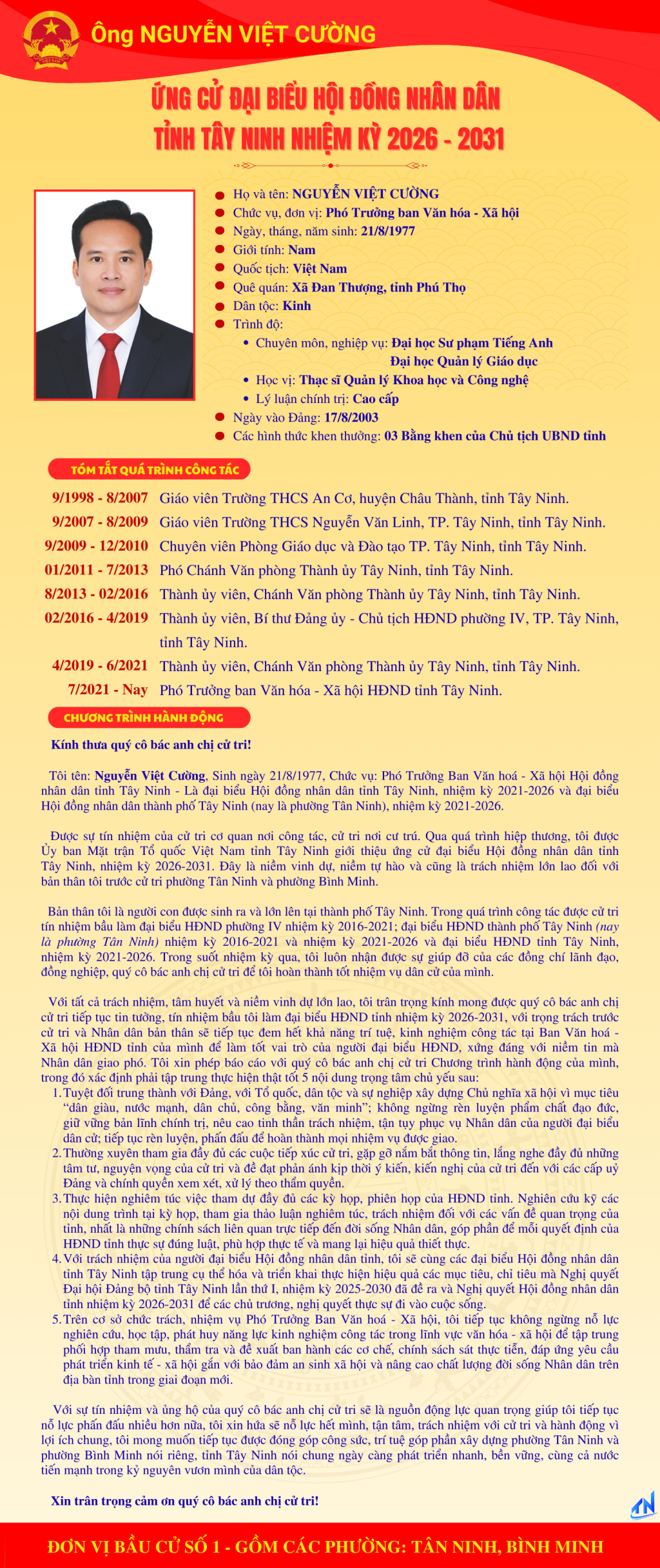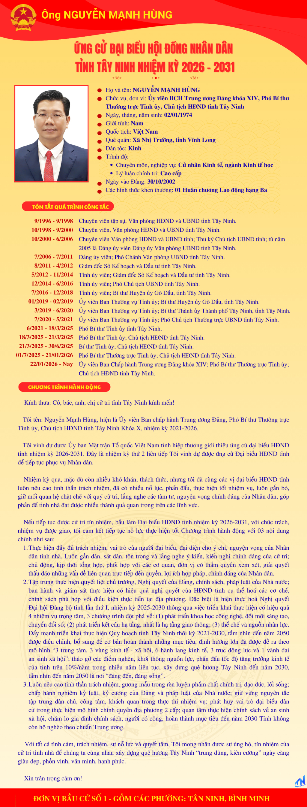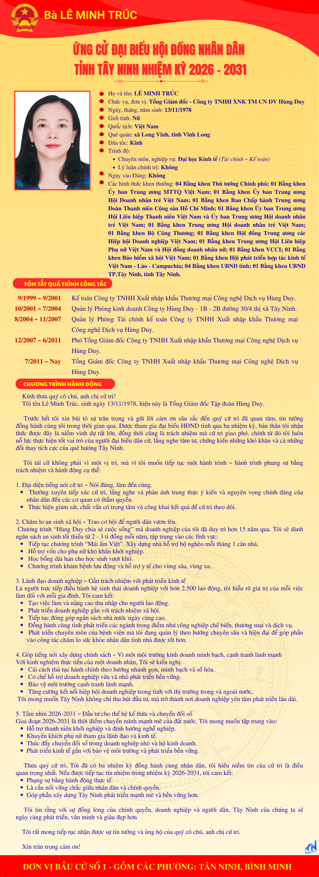 Tóm tắt quá trình công tác và chương trình hành động của người ứng cử đại biểu HĐND tỉnh Tây Ninh nhiệm kỳ 2026-2031 (Đơn vị bầu cử số 1)