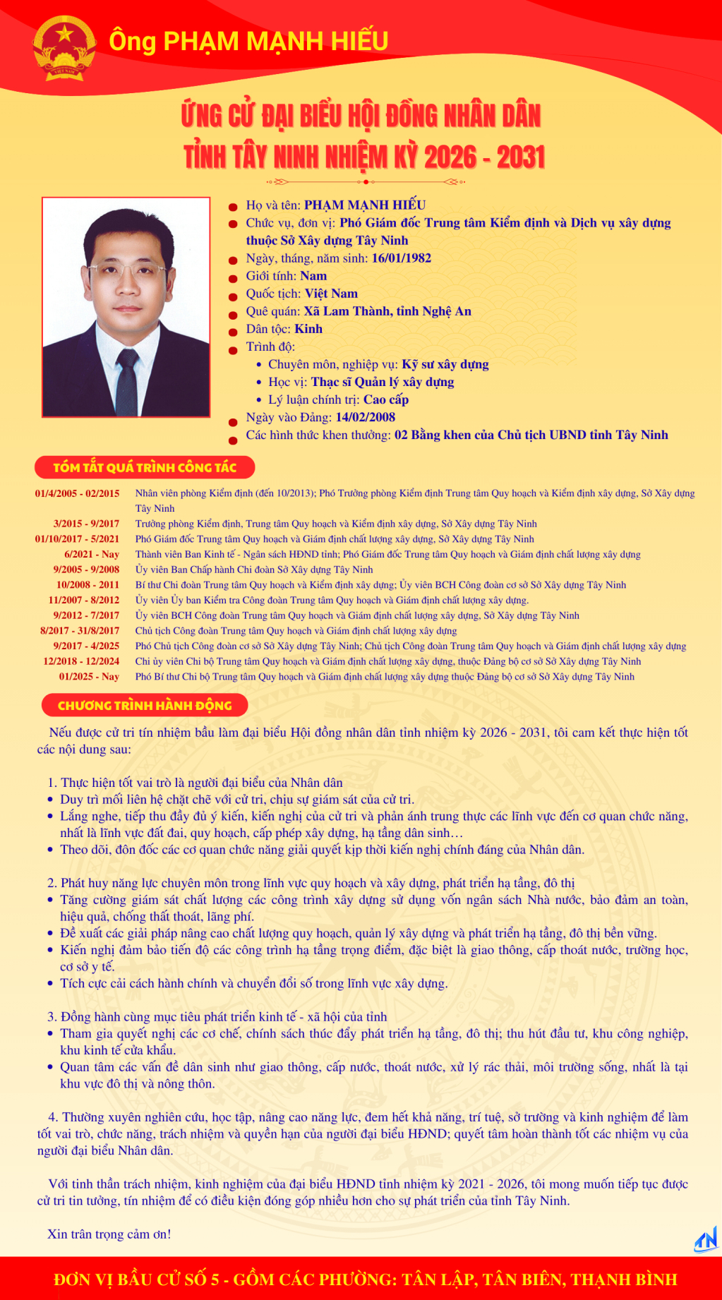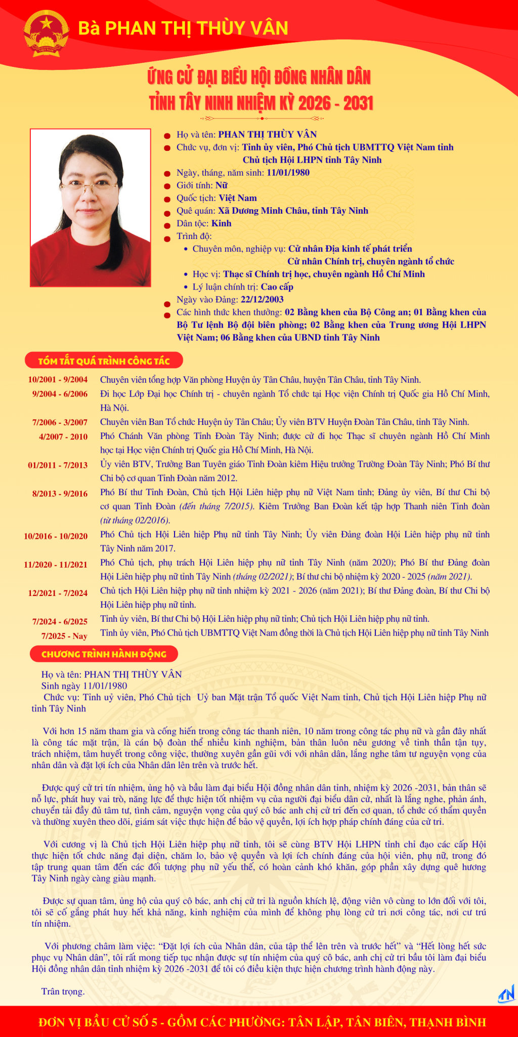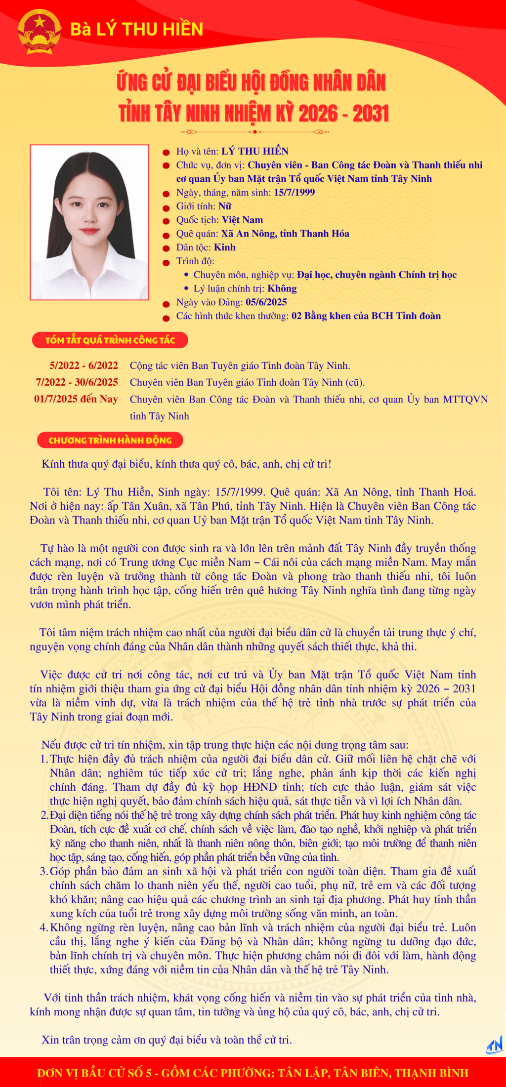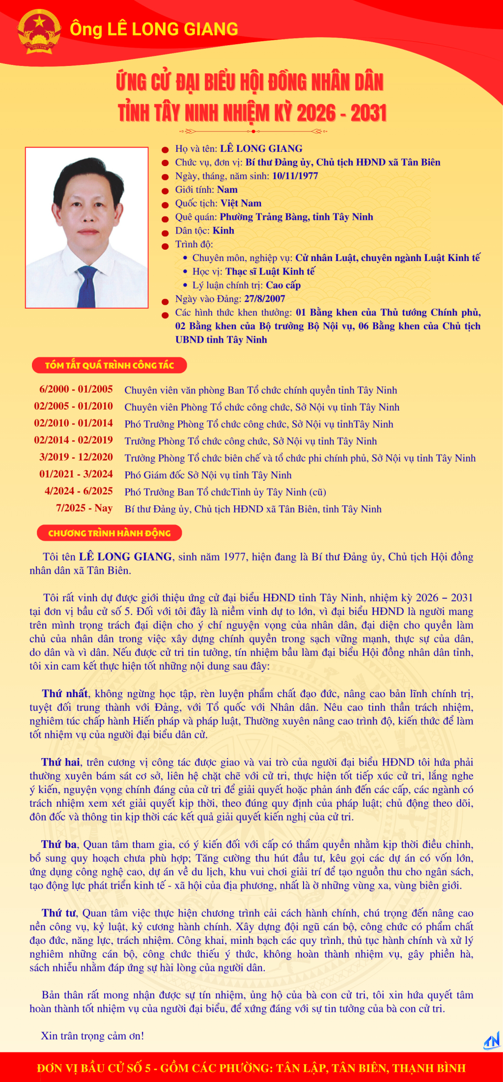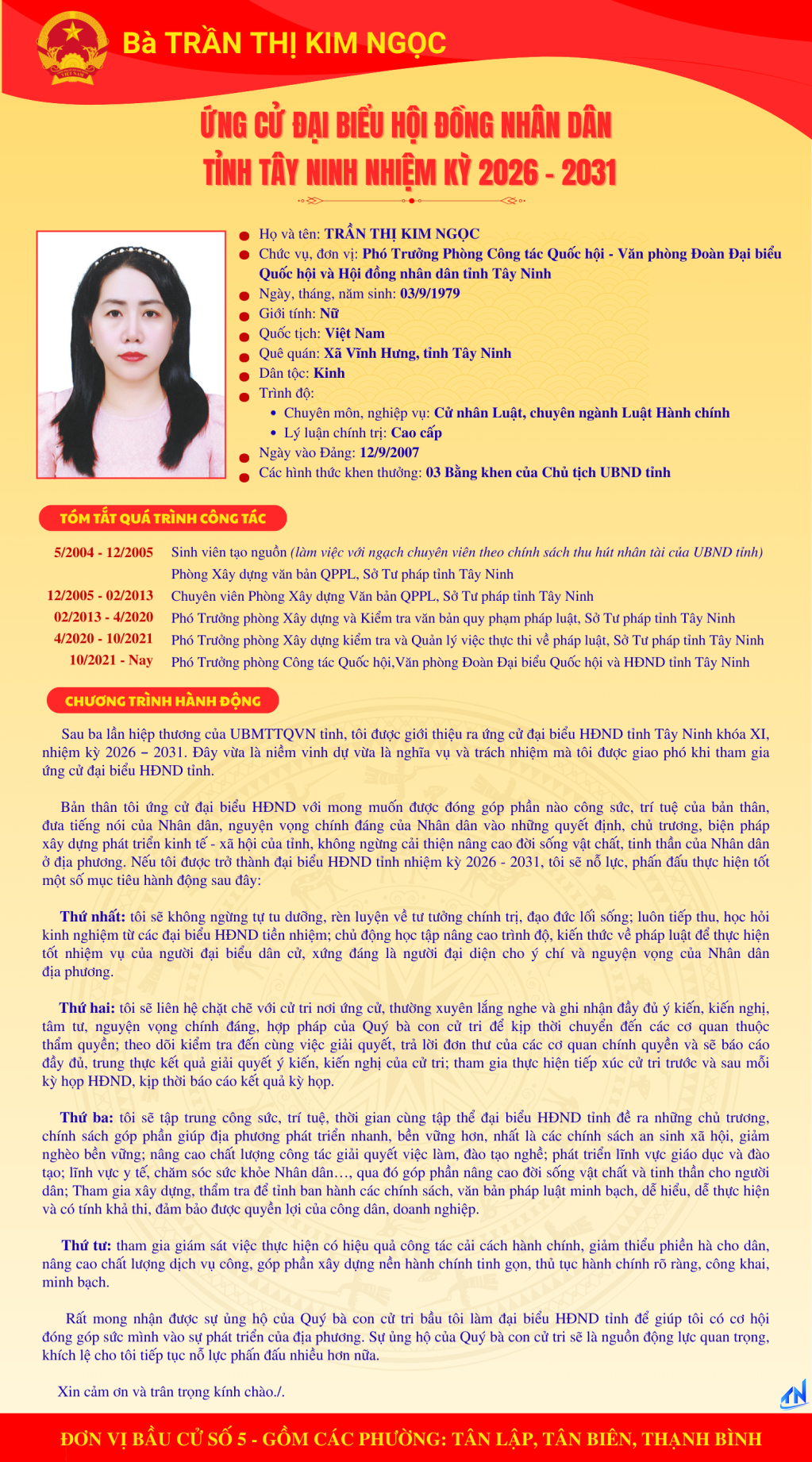 Tóm tắt quá trình công tác và chương trình hành động của người ứng cử đại biểu HĐND tỉnh Tây Ninh nhiệm kỳ 2026-2031 (Đơn vị bầu cử số 5)
