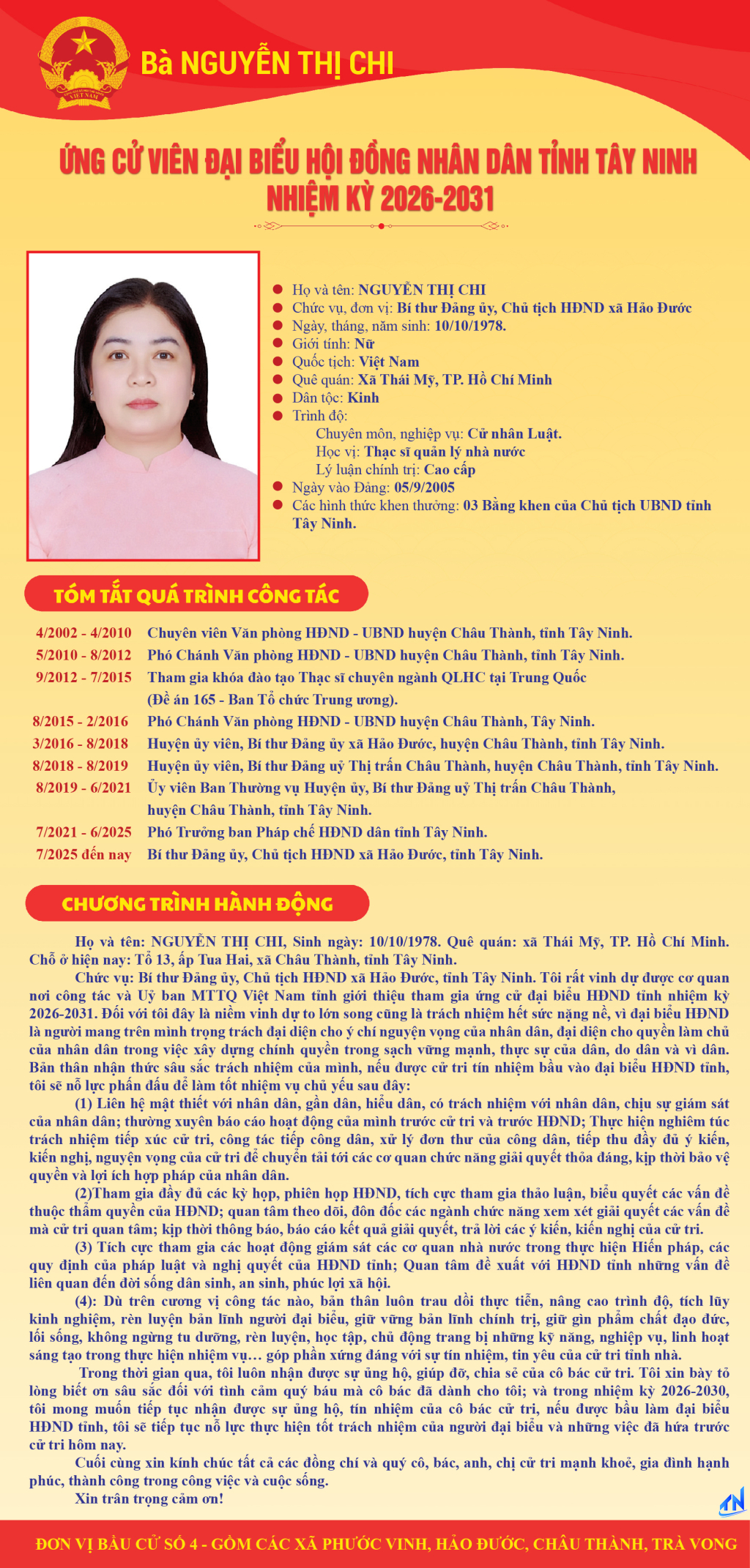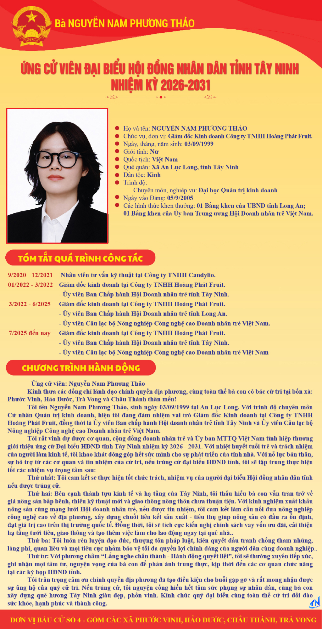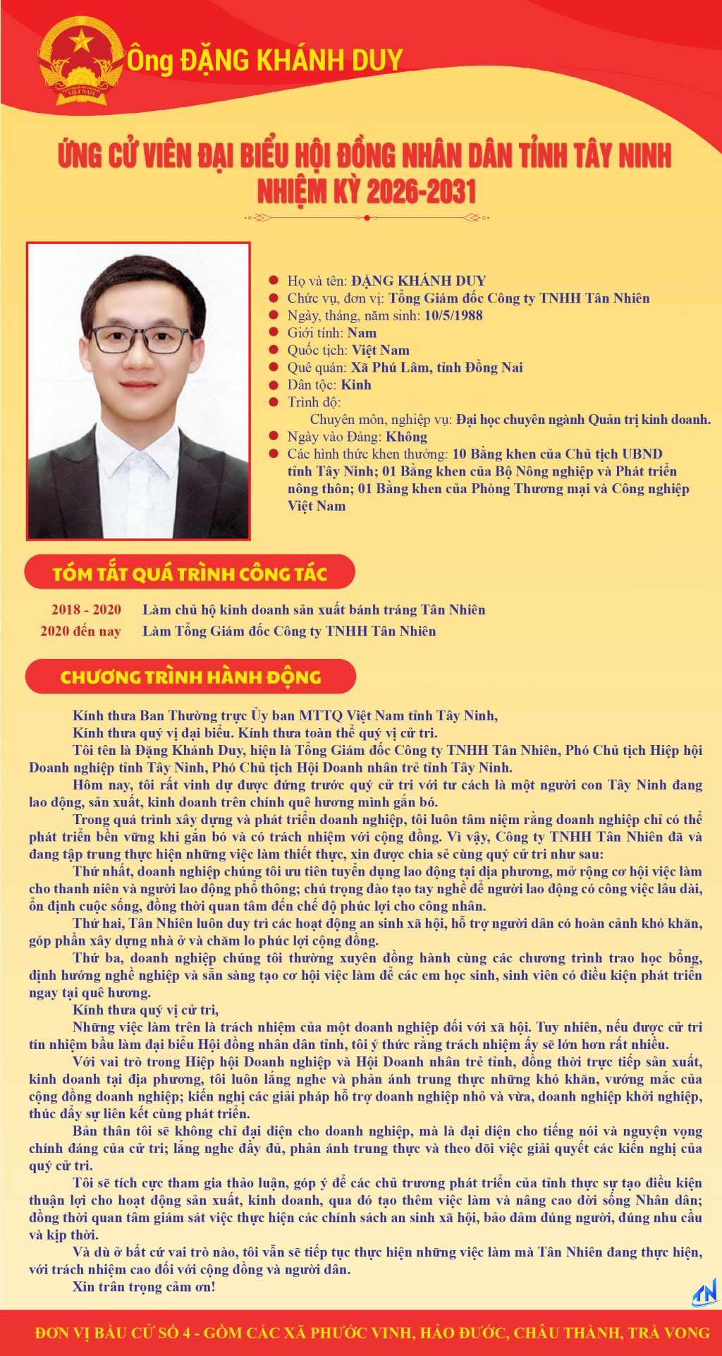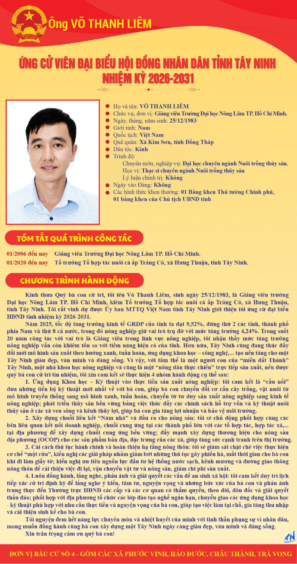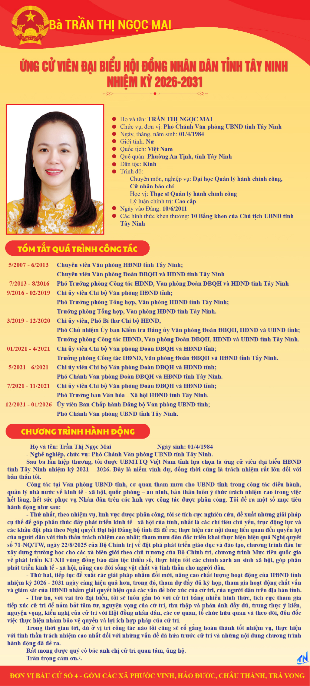Tóm tắt quá trình công tác và chương trình hành động của người ứng cử đại biểu HĐND tỉnh Tây Ninh nhiệm kỳ 2026-2031 (Đơn vị bầu cử số 4)