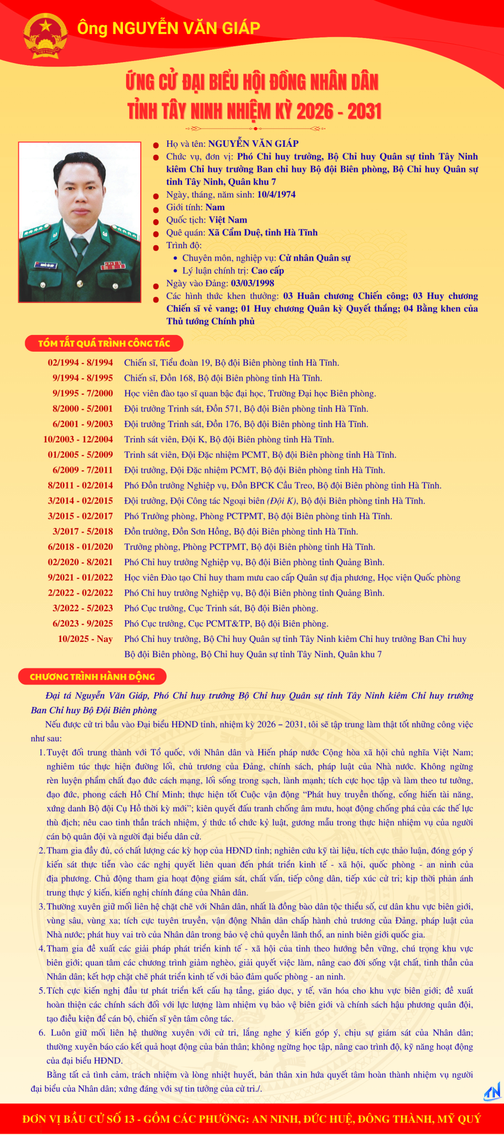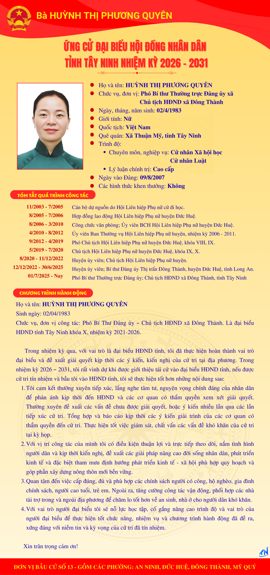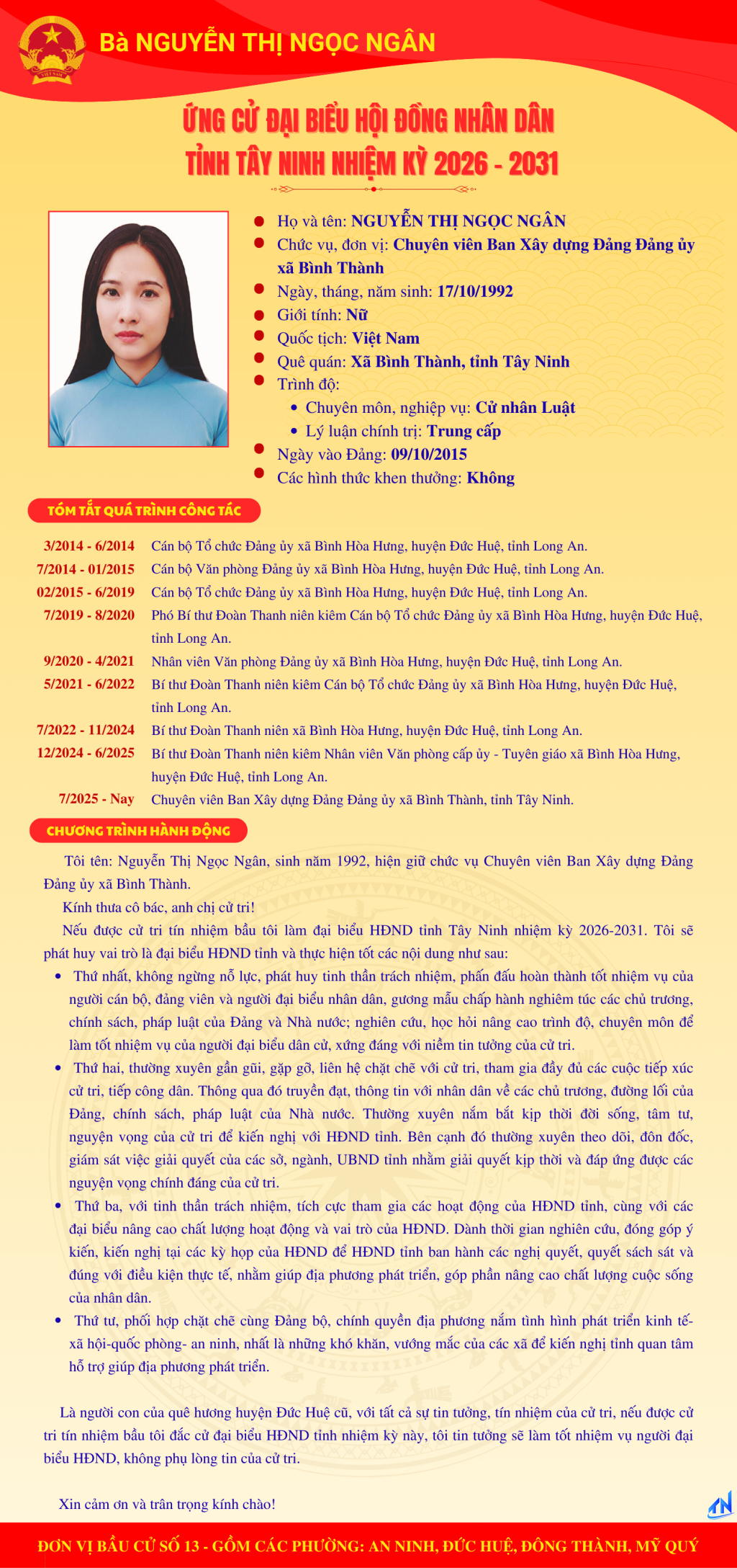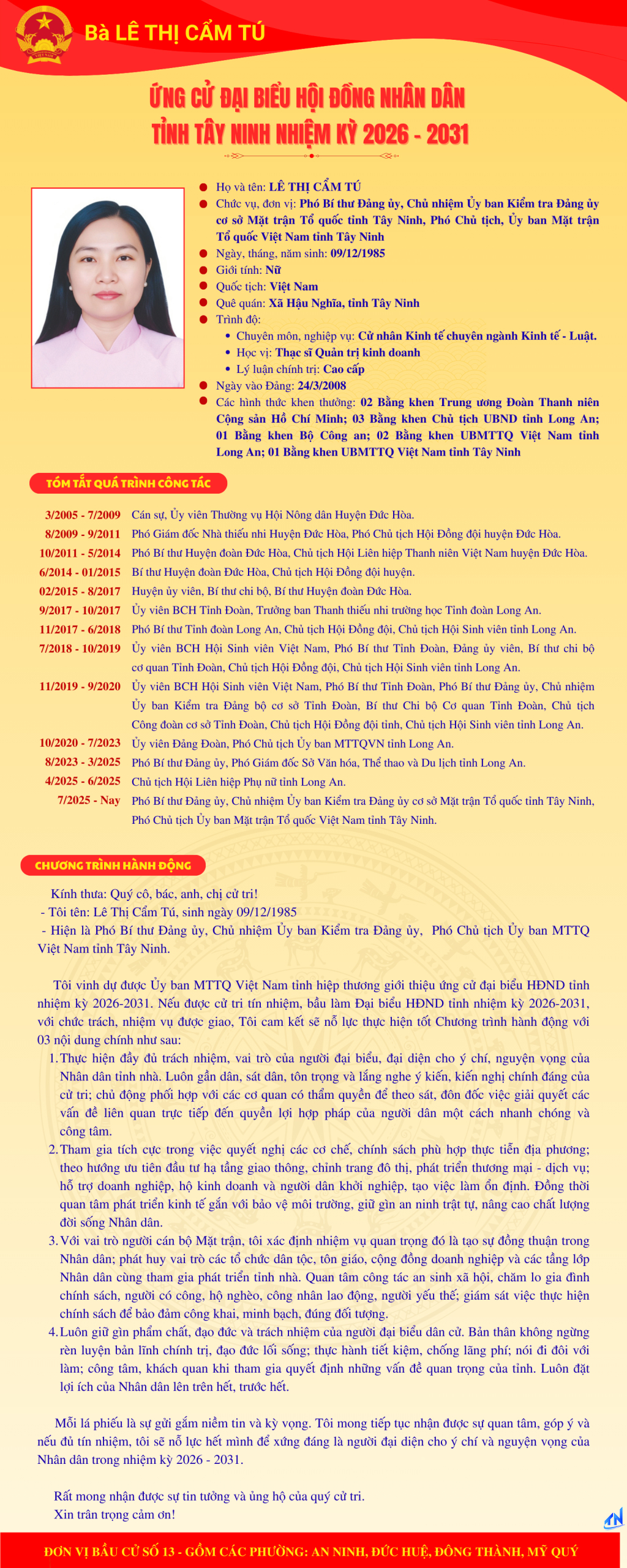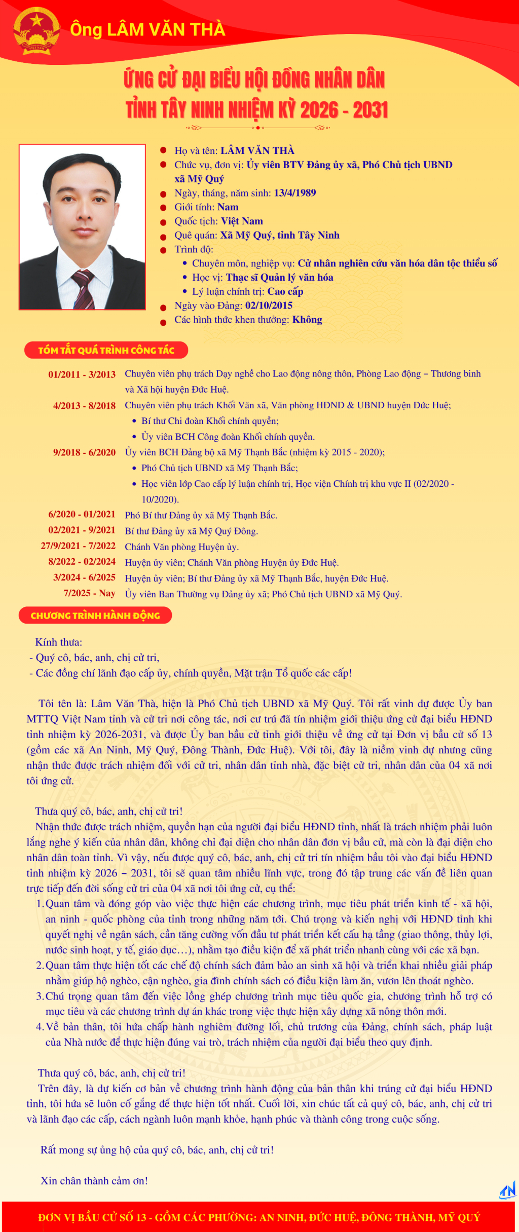 Tóm tắt quá trình công tác và chương trình hành động của người ứng cử đại biểu HĐND tỉnh Tây Ninh nhiệm kỳ 2026-2031 (Đơn vị bầu cử số 13)