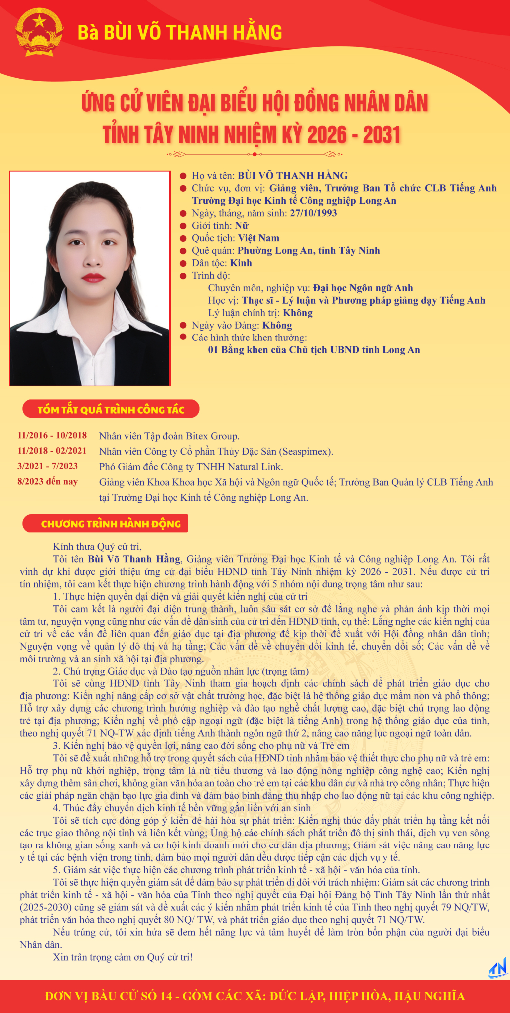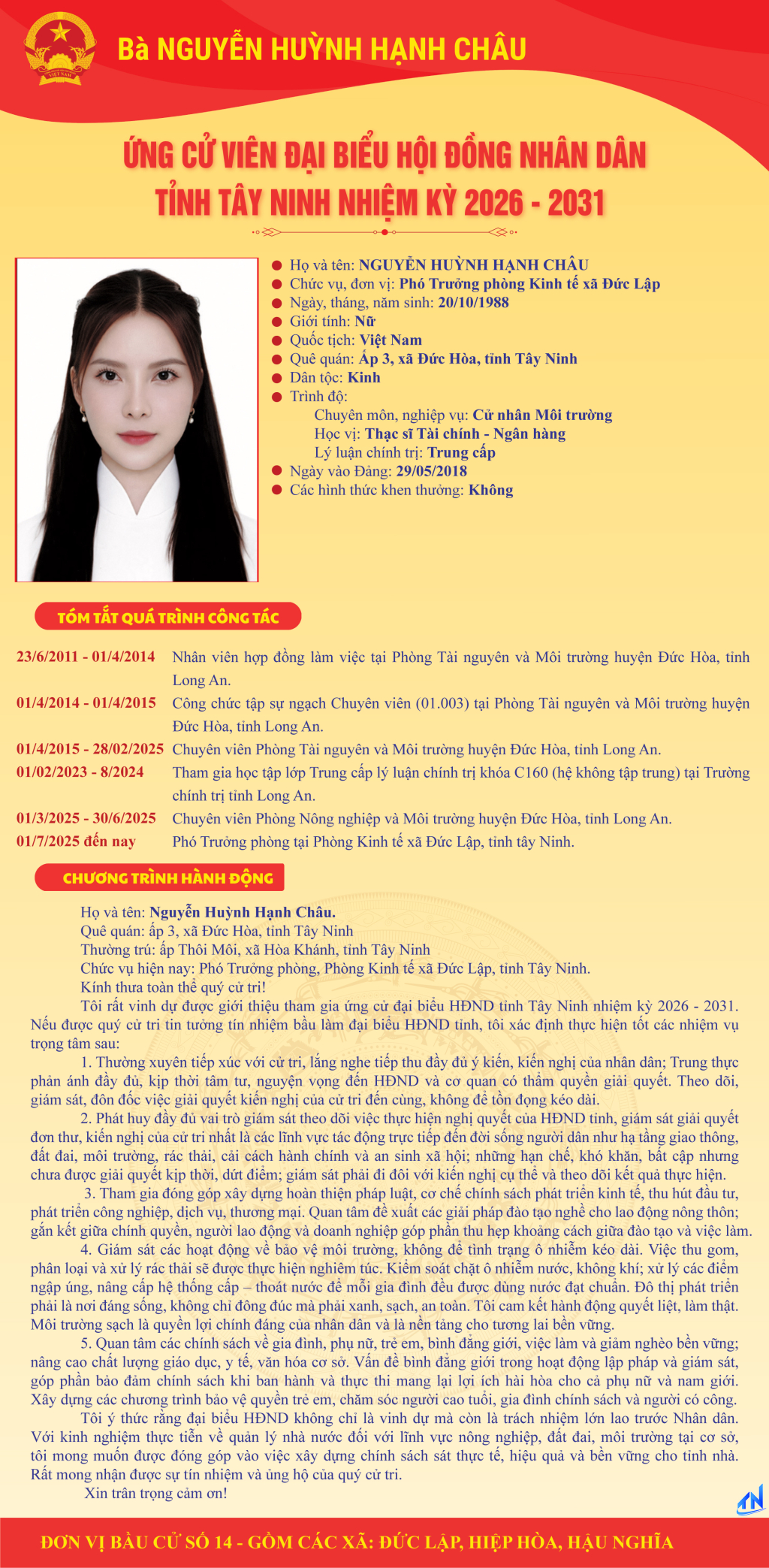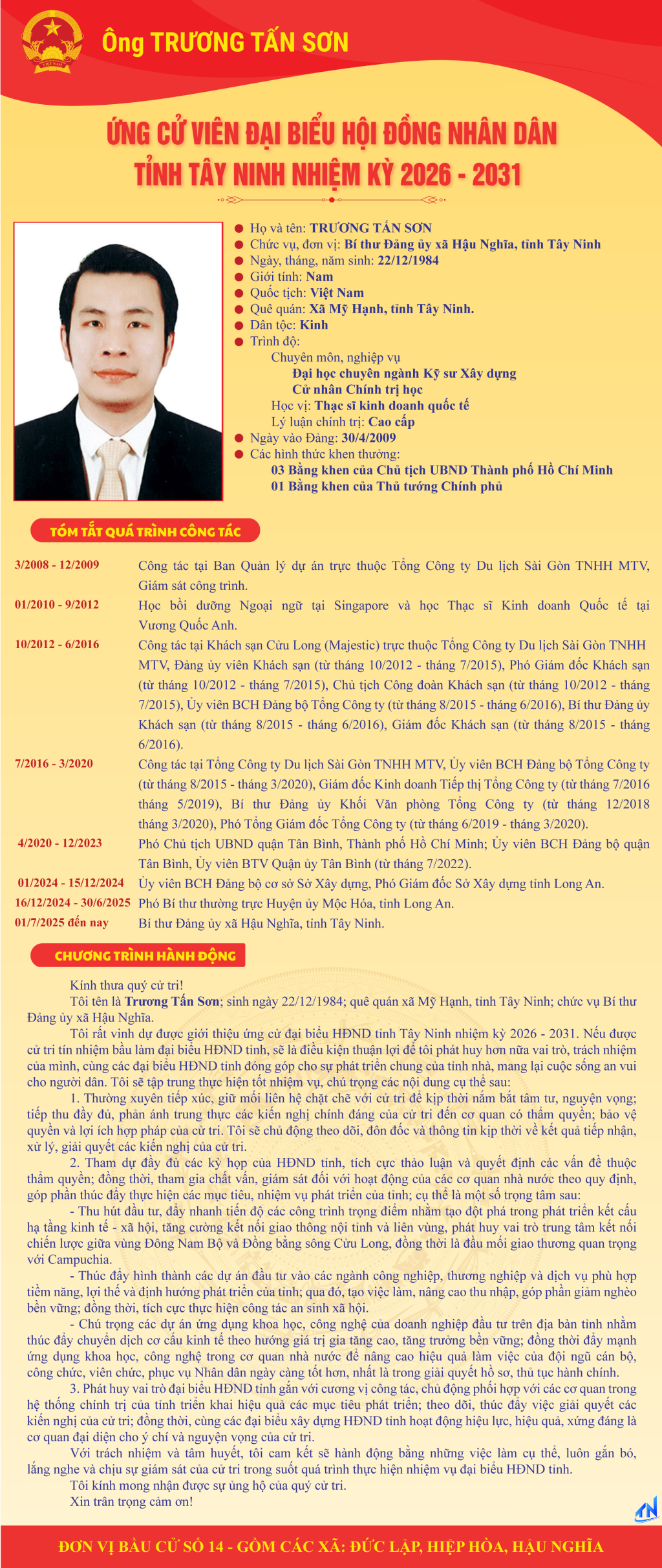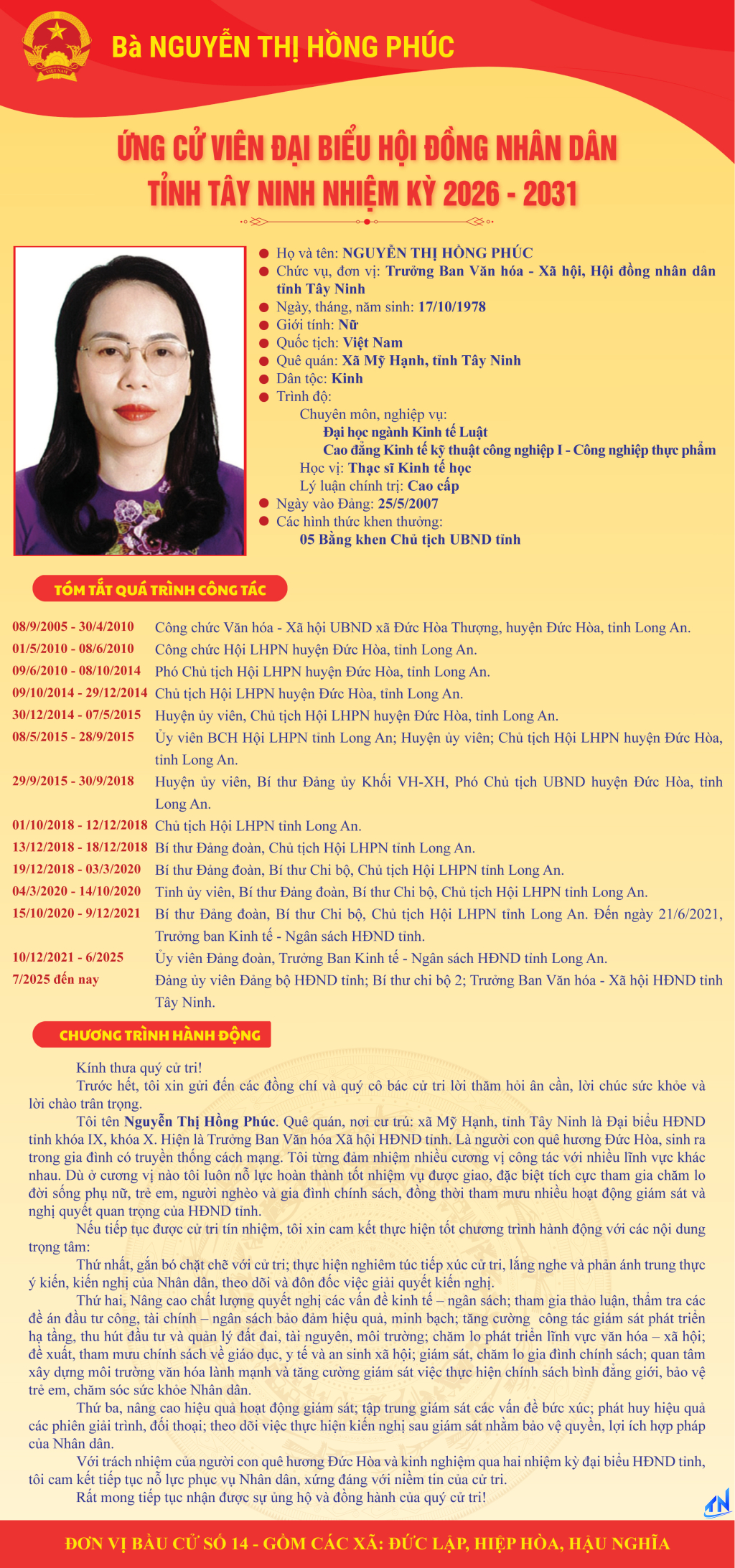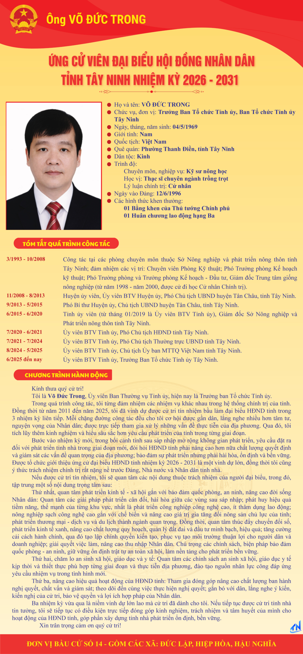 Tóm tắt quá trình công tác và chương trình hành động của người ứng cử đại biểu HĐND tỉnh Tây Ninh nhiệm kỳ 2026-2031 (Đơn vị bầu cử số 14)
