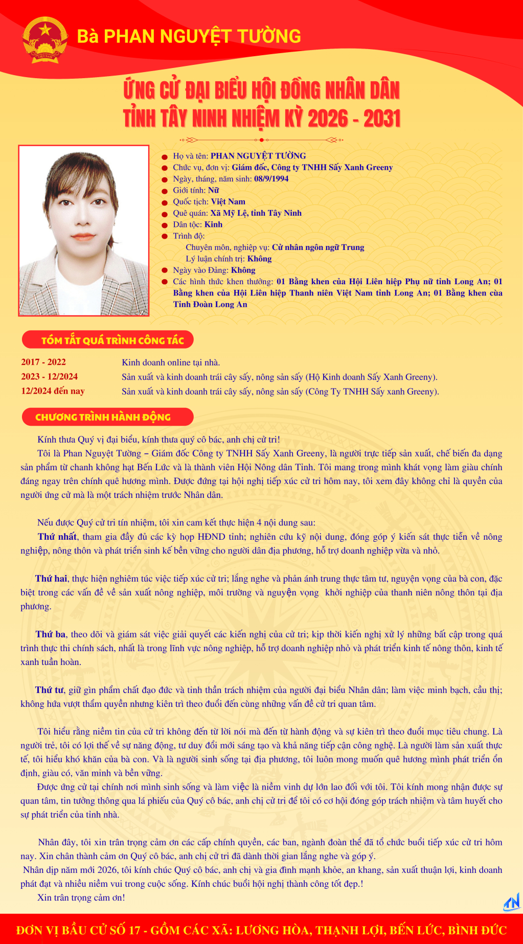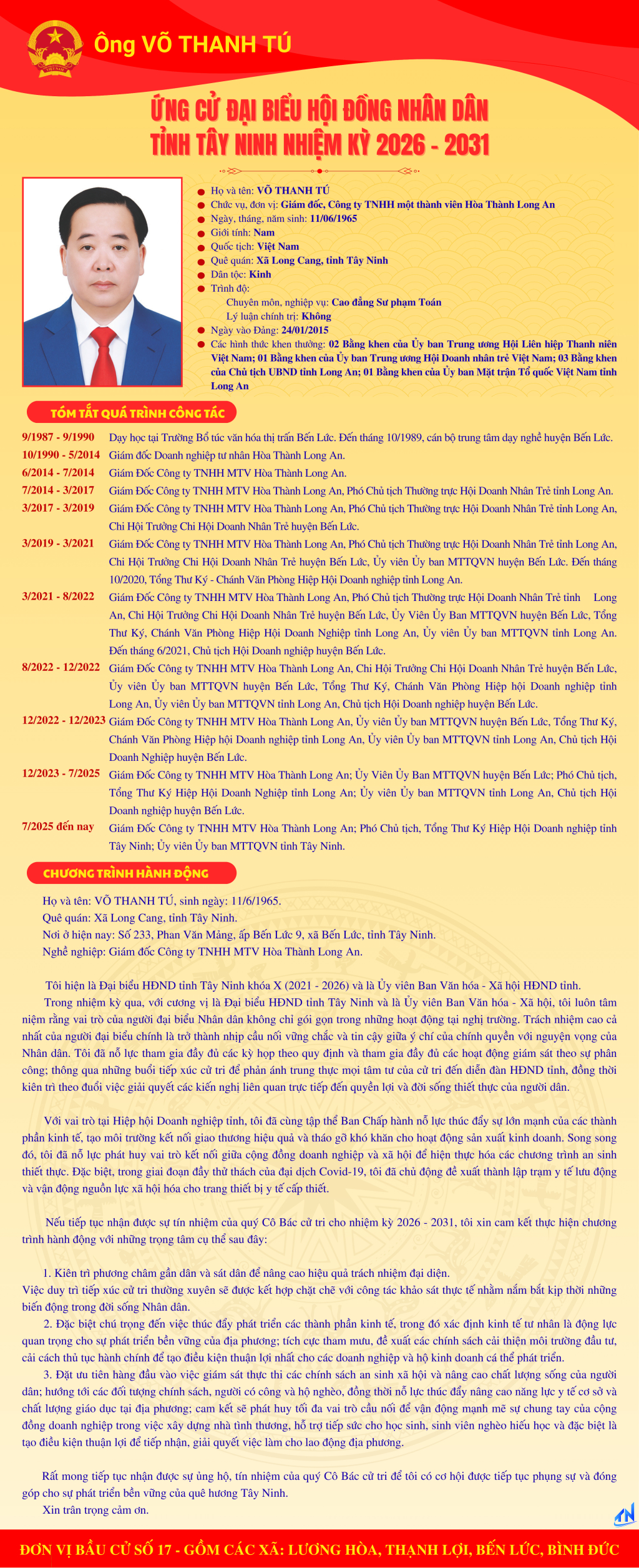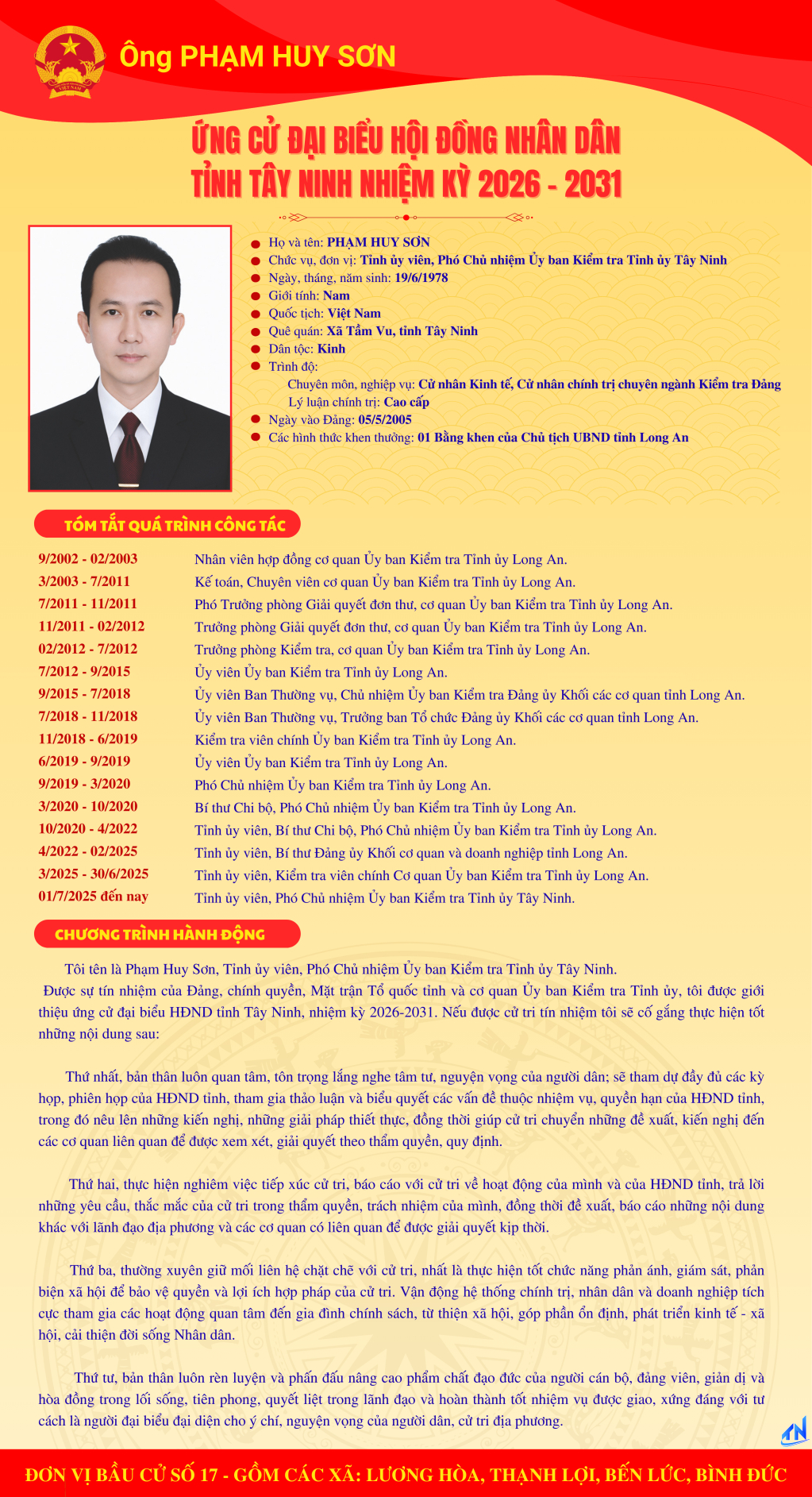 Tóm tắt quá trình công tác và chương trình hành động của người ứng cử đại biểu HĐND tỉnh Tây Ninh nhiệm kỳ 2026-2031 (Đơn vị bầu cử số 17)