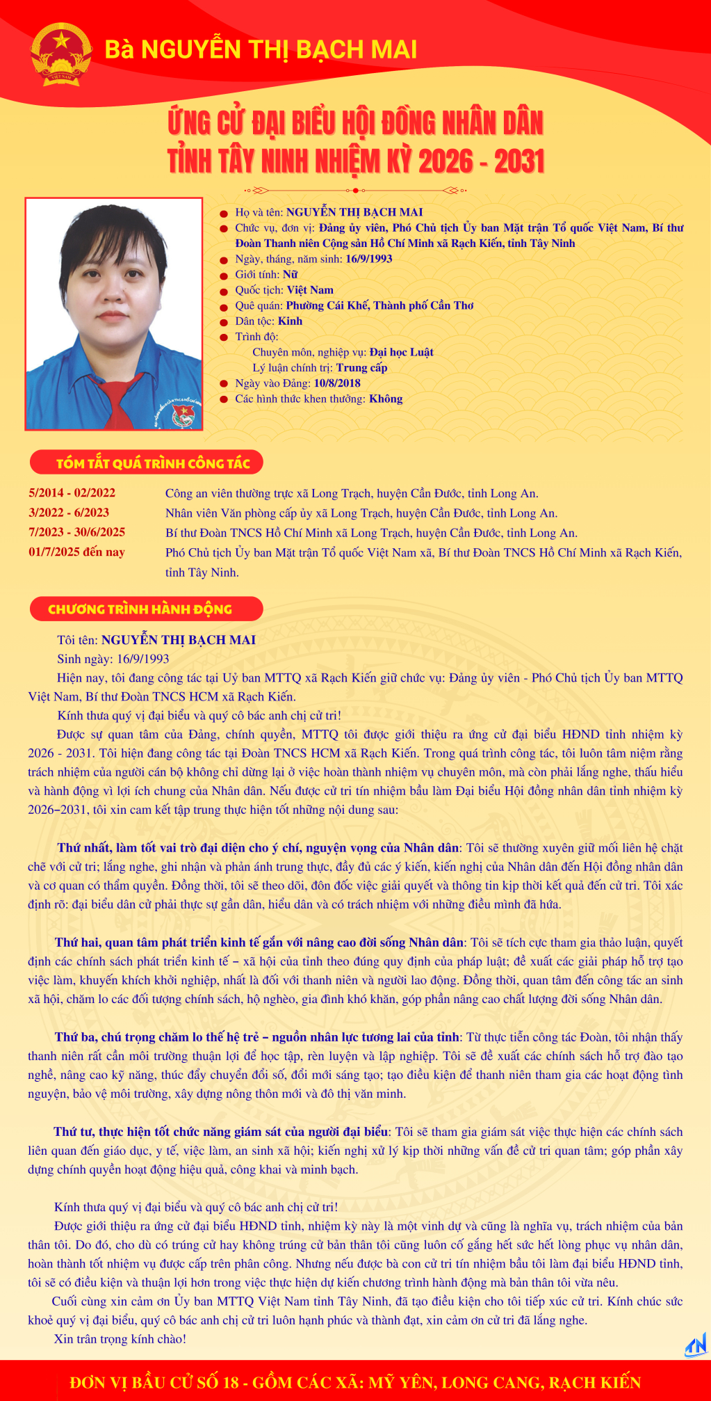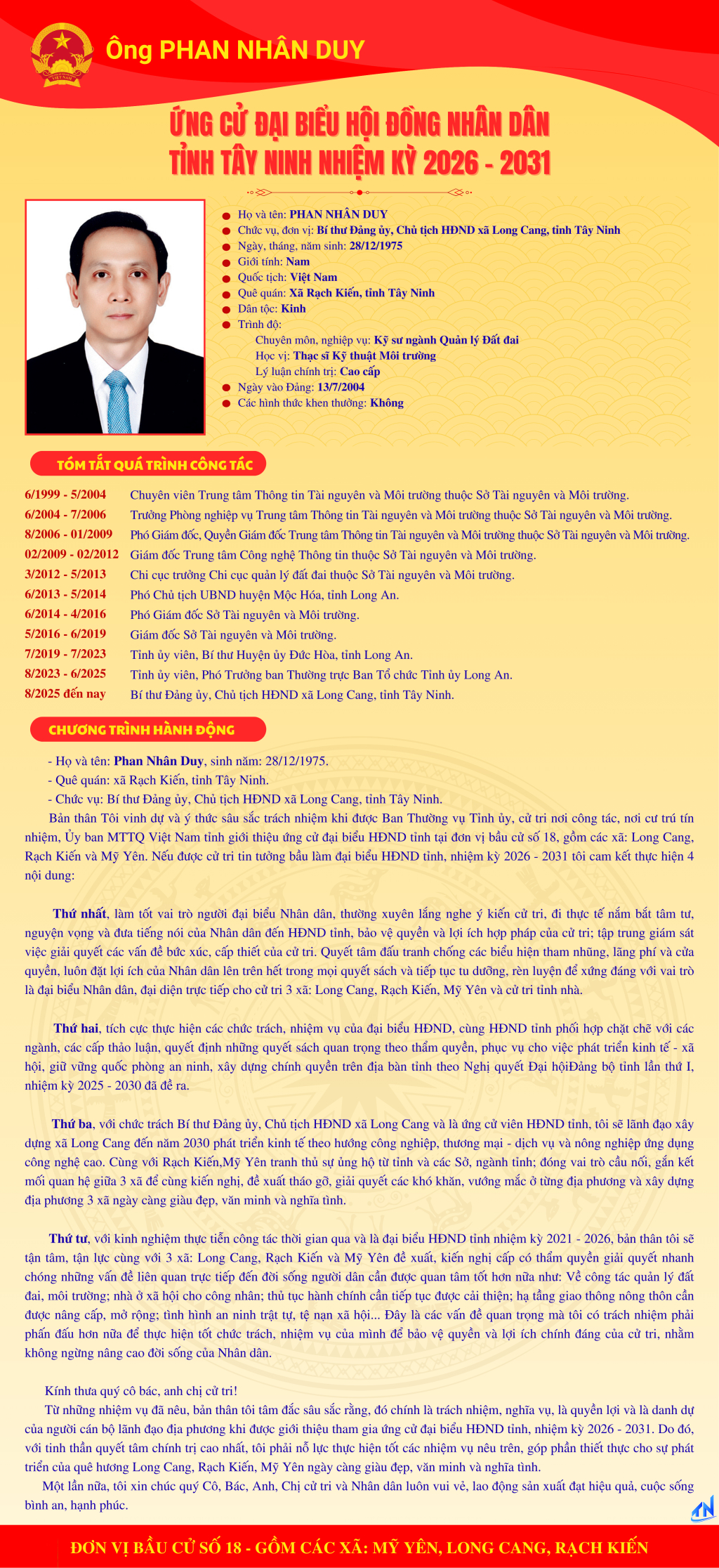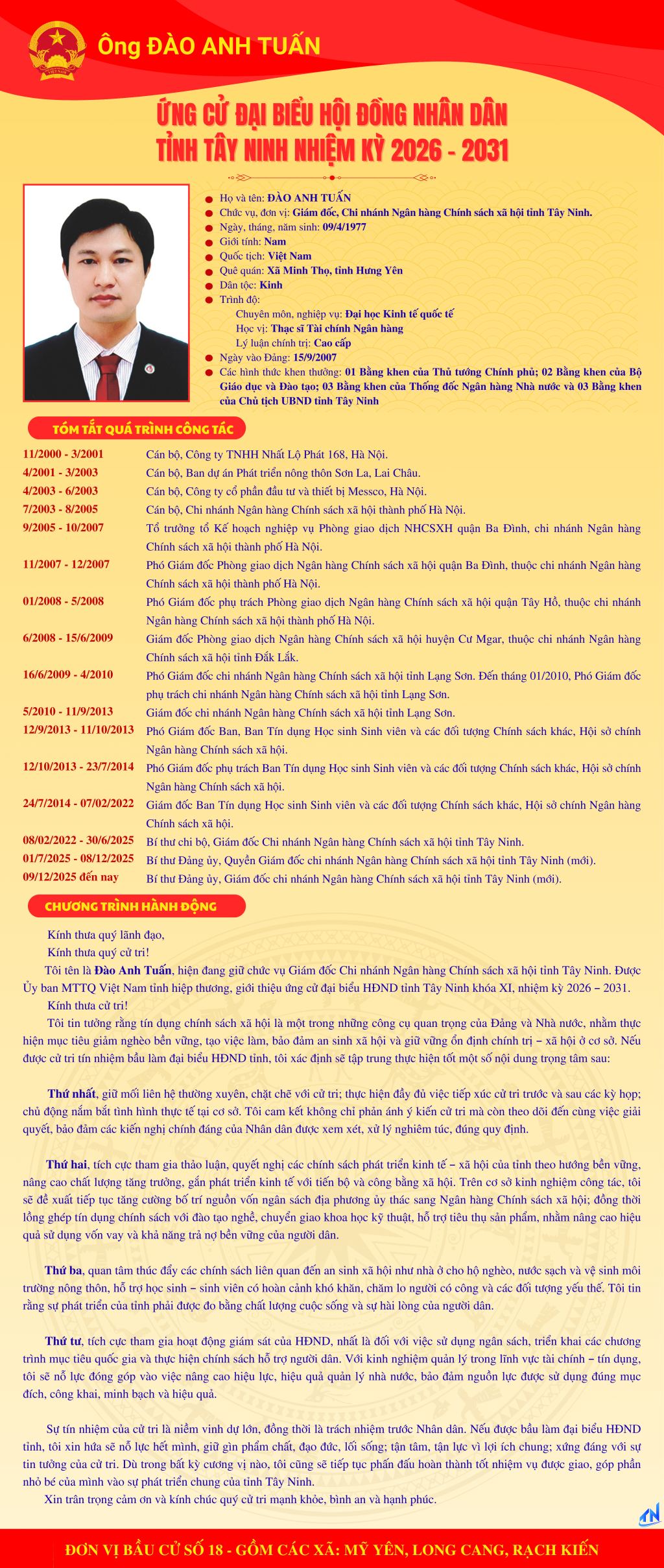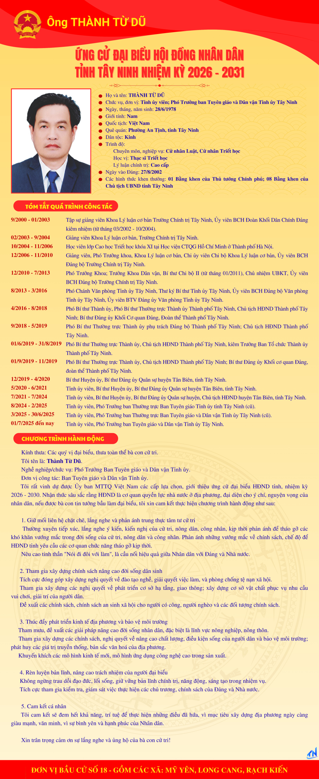 Tóm tắt quá trình công tác và chương trình hành động của người ứng cử đại biểu HĐND tỉnh Tây Ninh nhiệm kỳ 2026-2031 (Đơn vị bầu cử số 18)