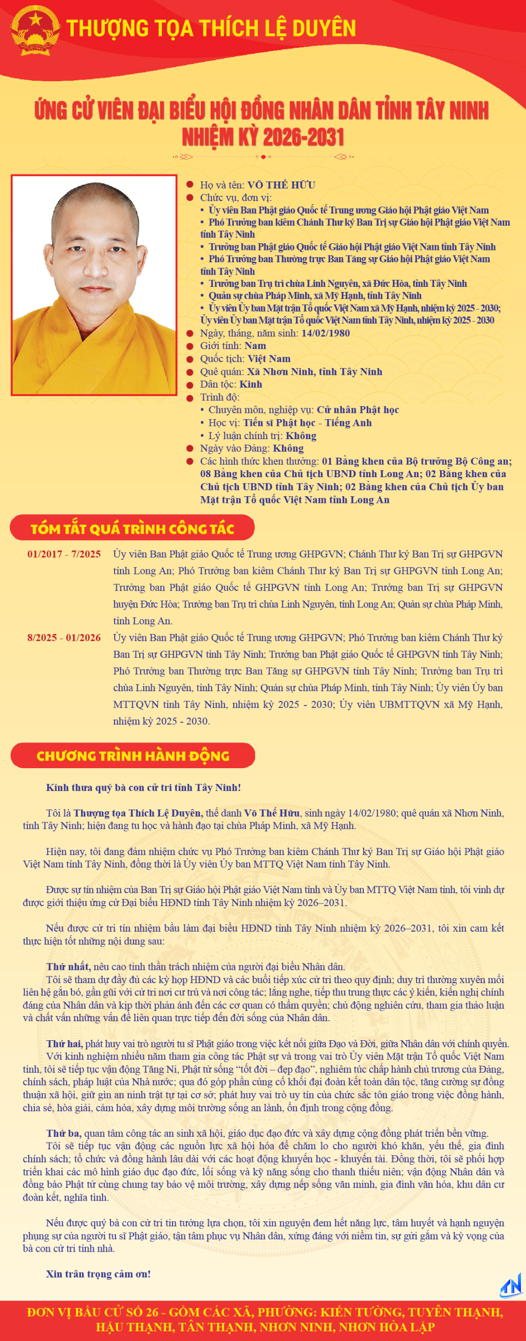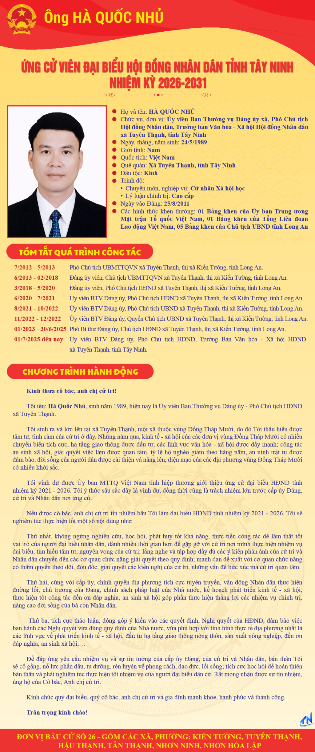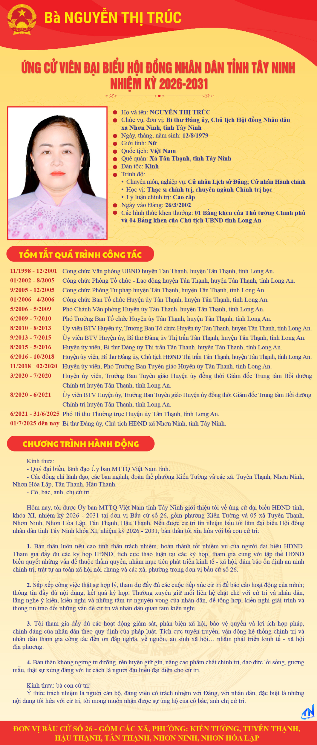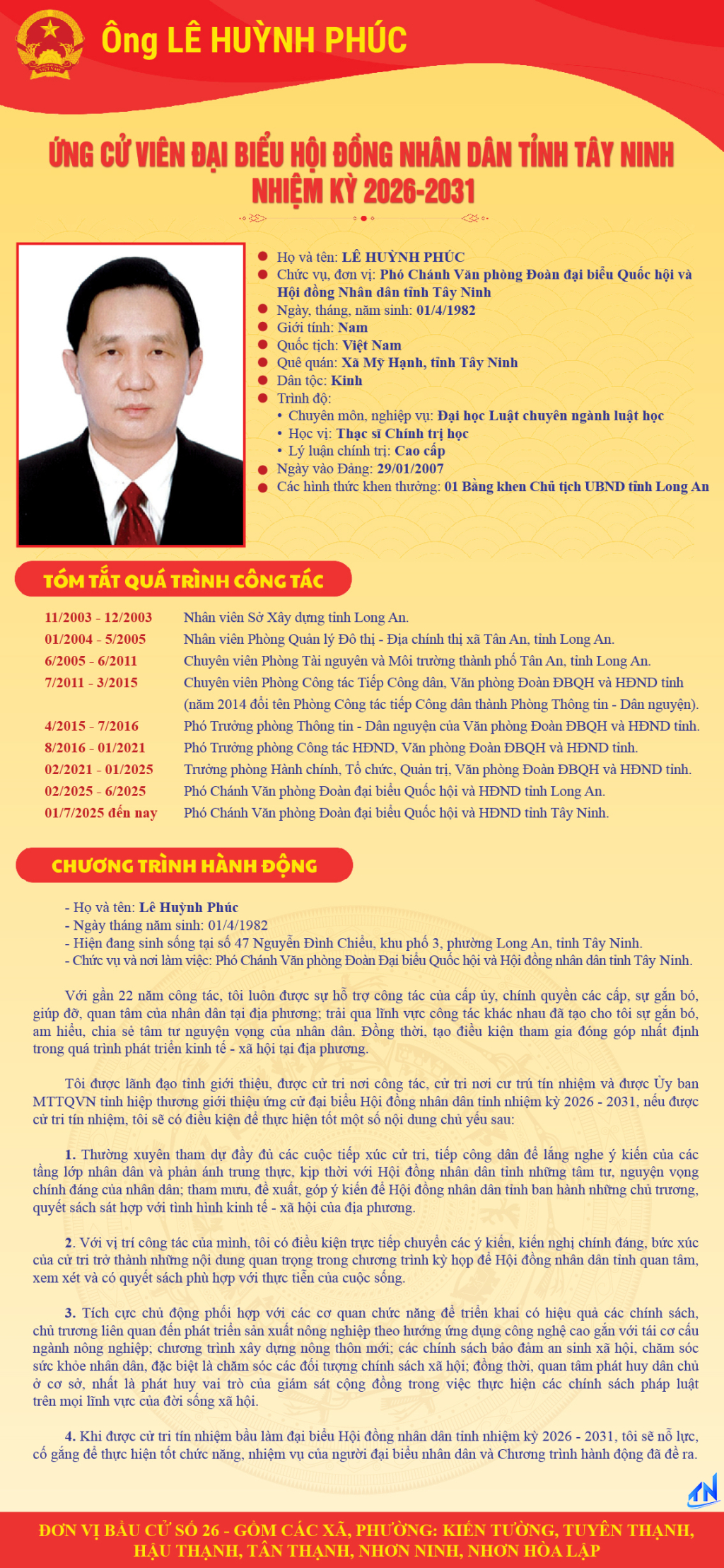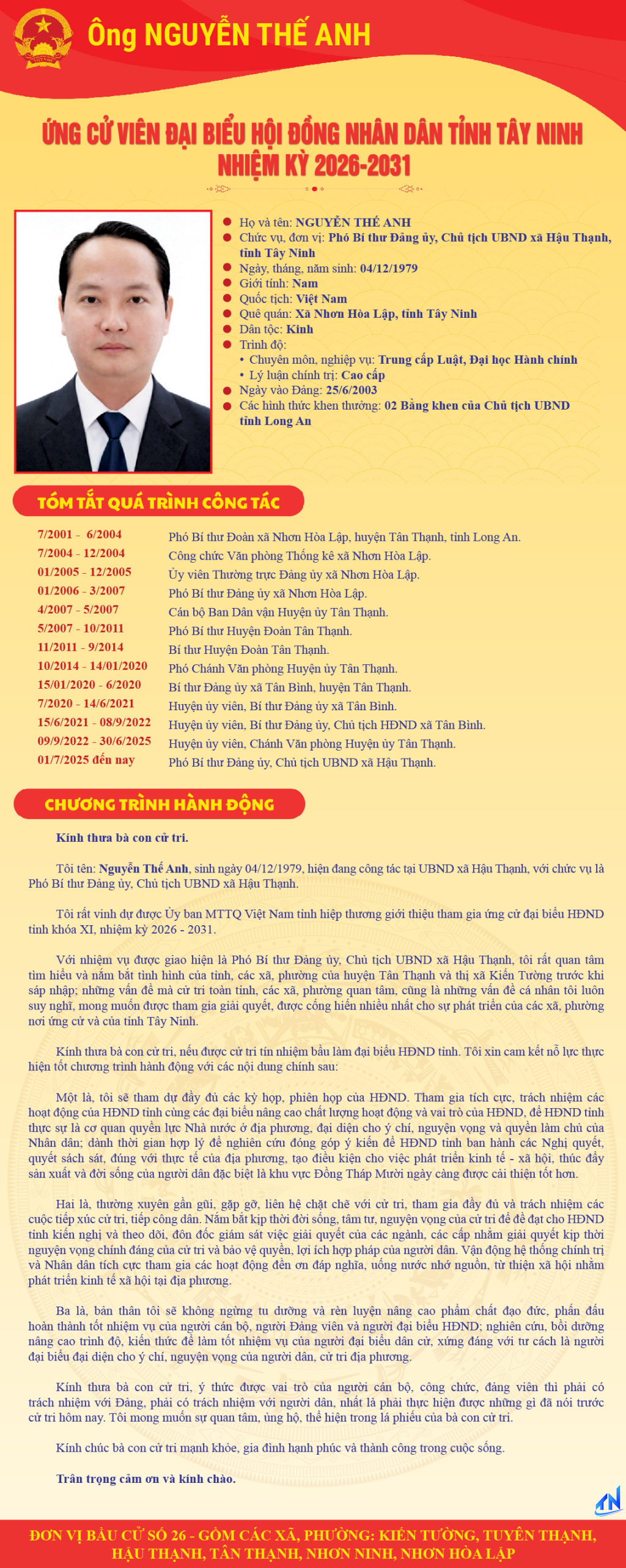 Tóm tắt quá trình công tác và chương trình hành động của người ứng cử đại biểu HĐND tỉnh Tây Ninh nhiệm kỳ 2026-2031 (Đơn vị bầu cử số 26)